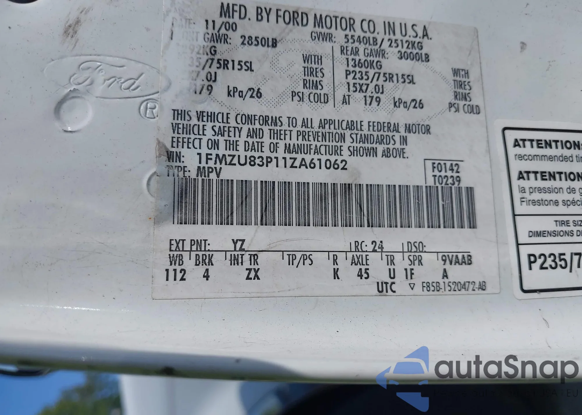 LOT: 43229344 VIN: 1FMZU83P11ZA61062