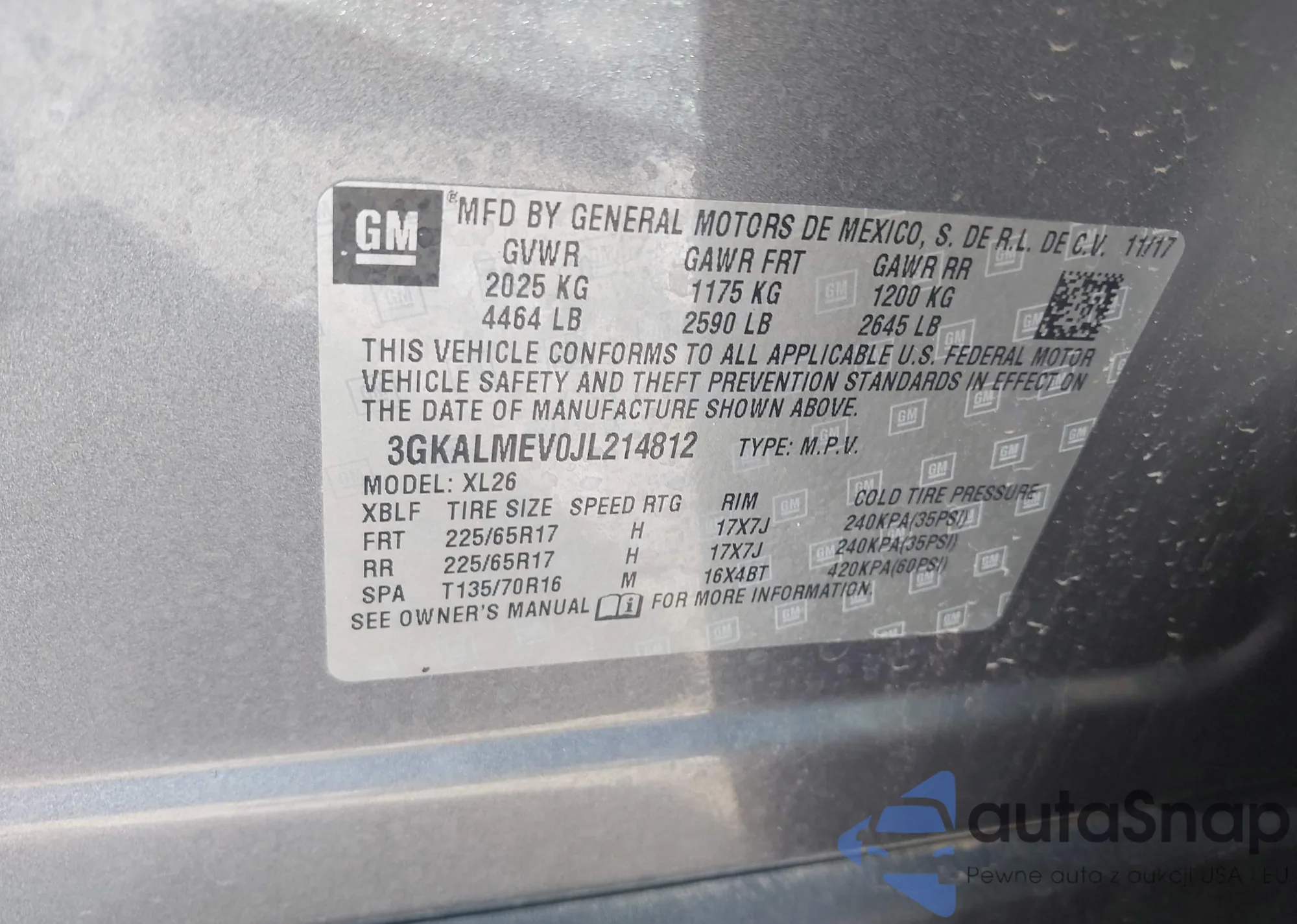 LOT: 43381272 VIN: 3GKALMEV0JL214812