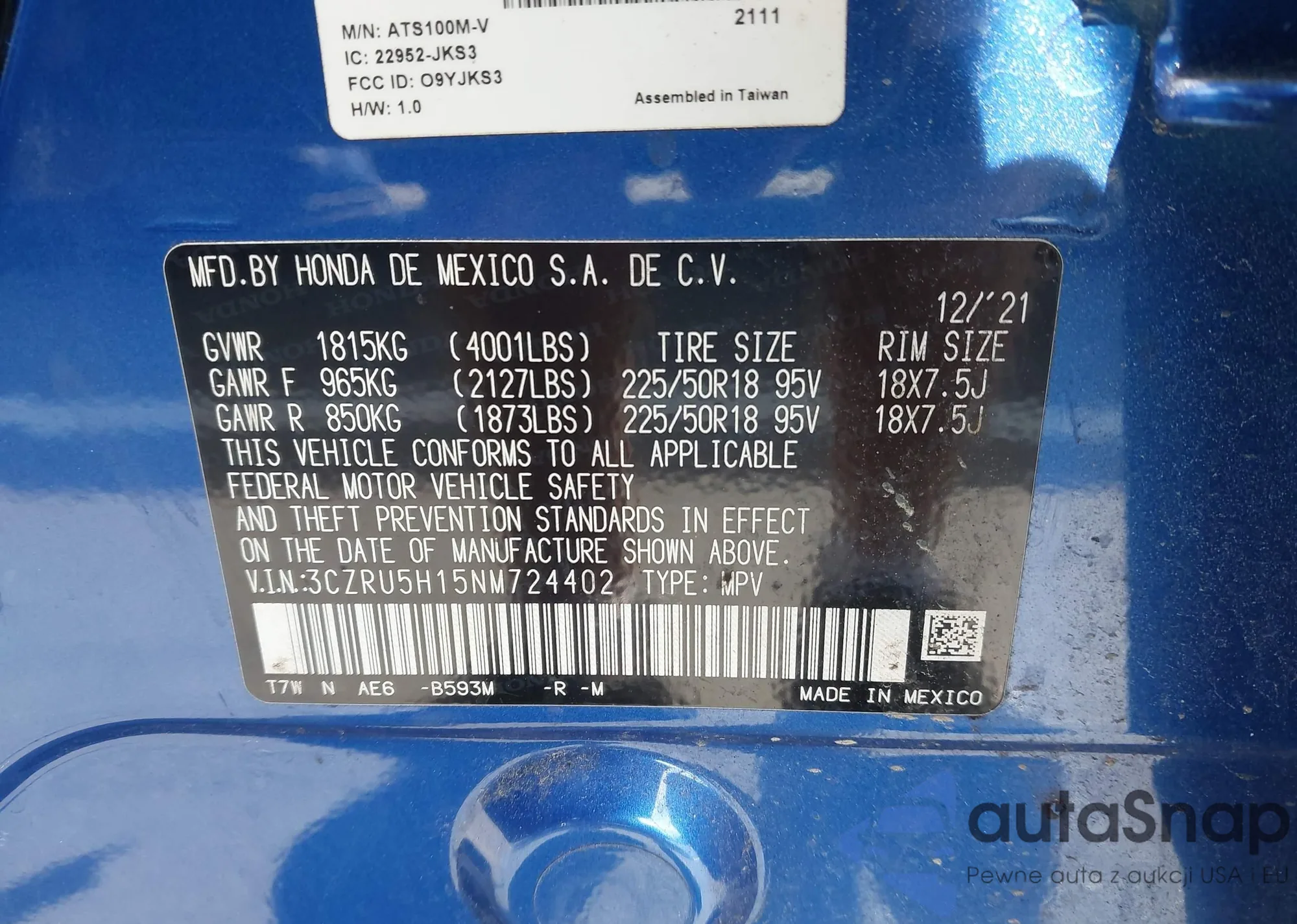 • VIN 3CZRU5H15NM724402