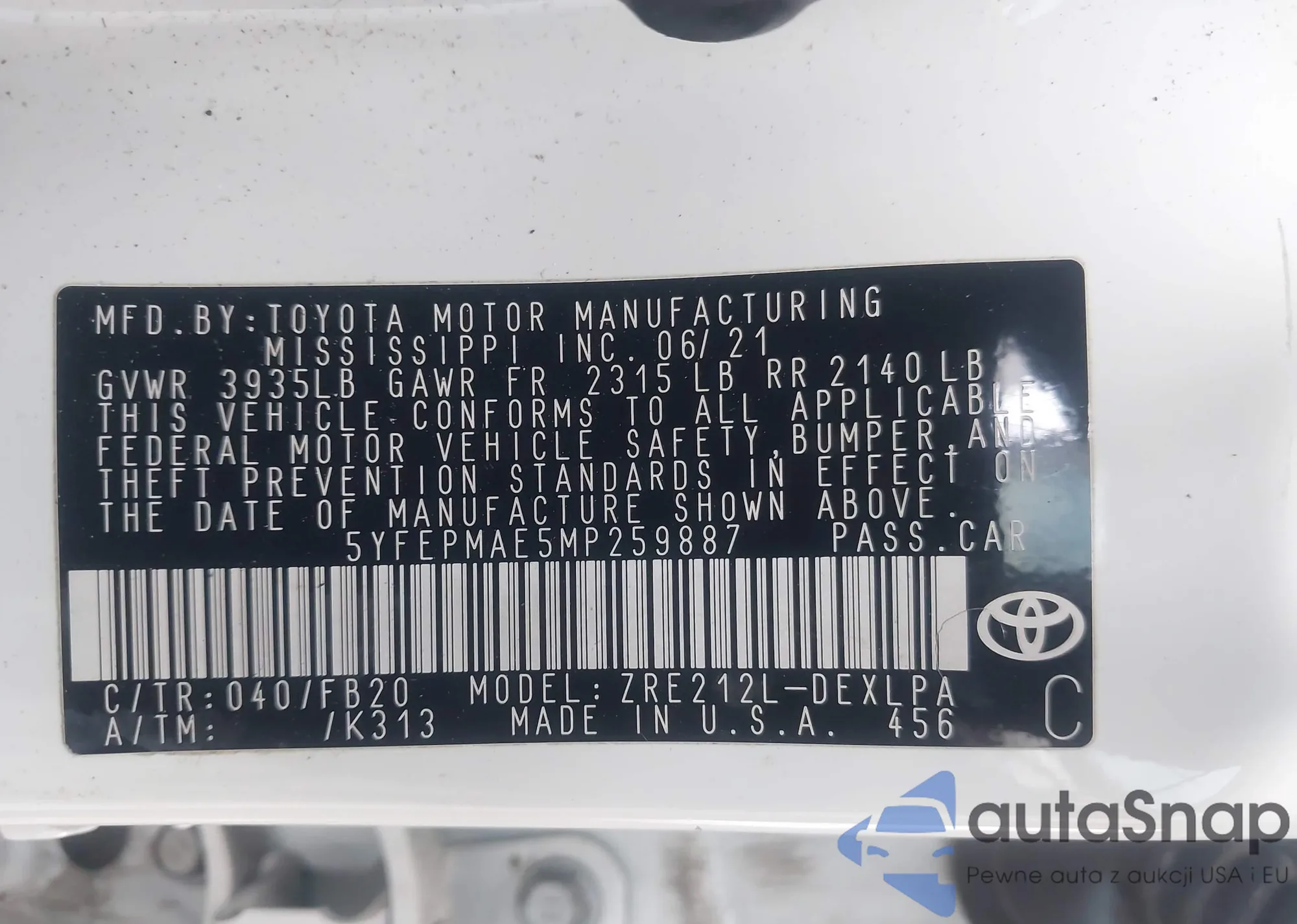 LOT: 43708696 VIN: 5YFEPMAE5MP259887