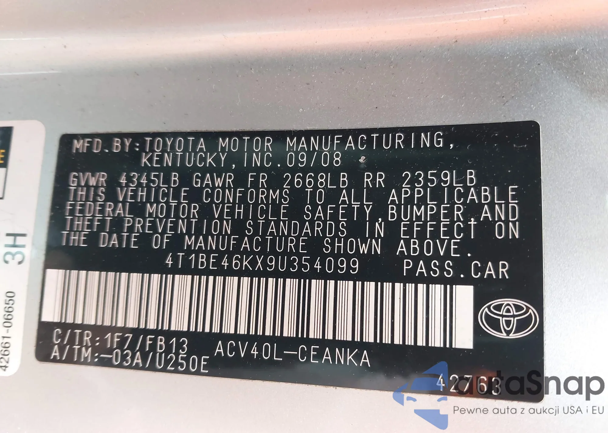 • VIN 4T1BE46KX9U354099