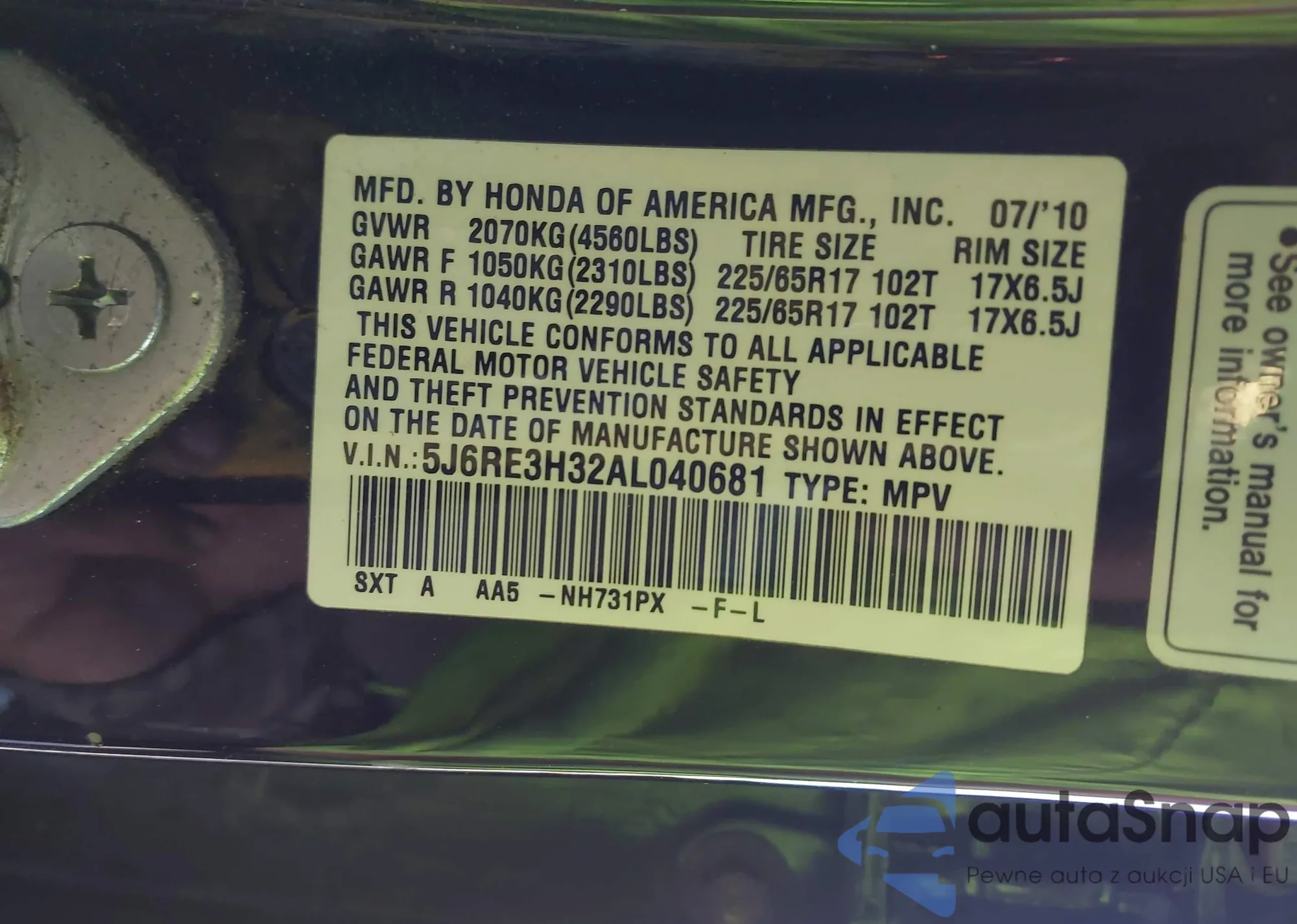 2010 Honda Cr-V Lx из США, поврежденный, VIN 5J6RE3H32AL040681