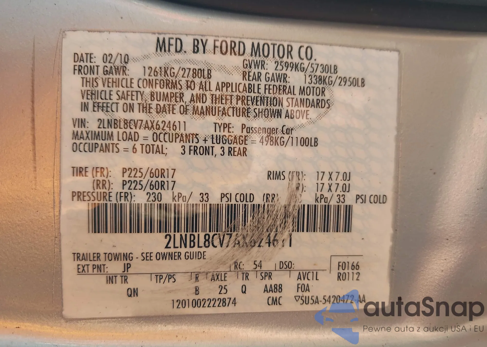 LOT: 43802354 VIN: 2LNBL8CV7AX624611
