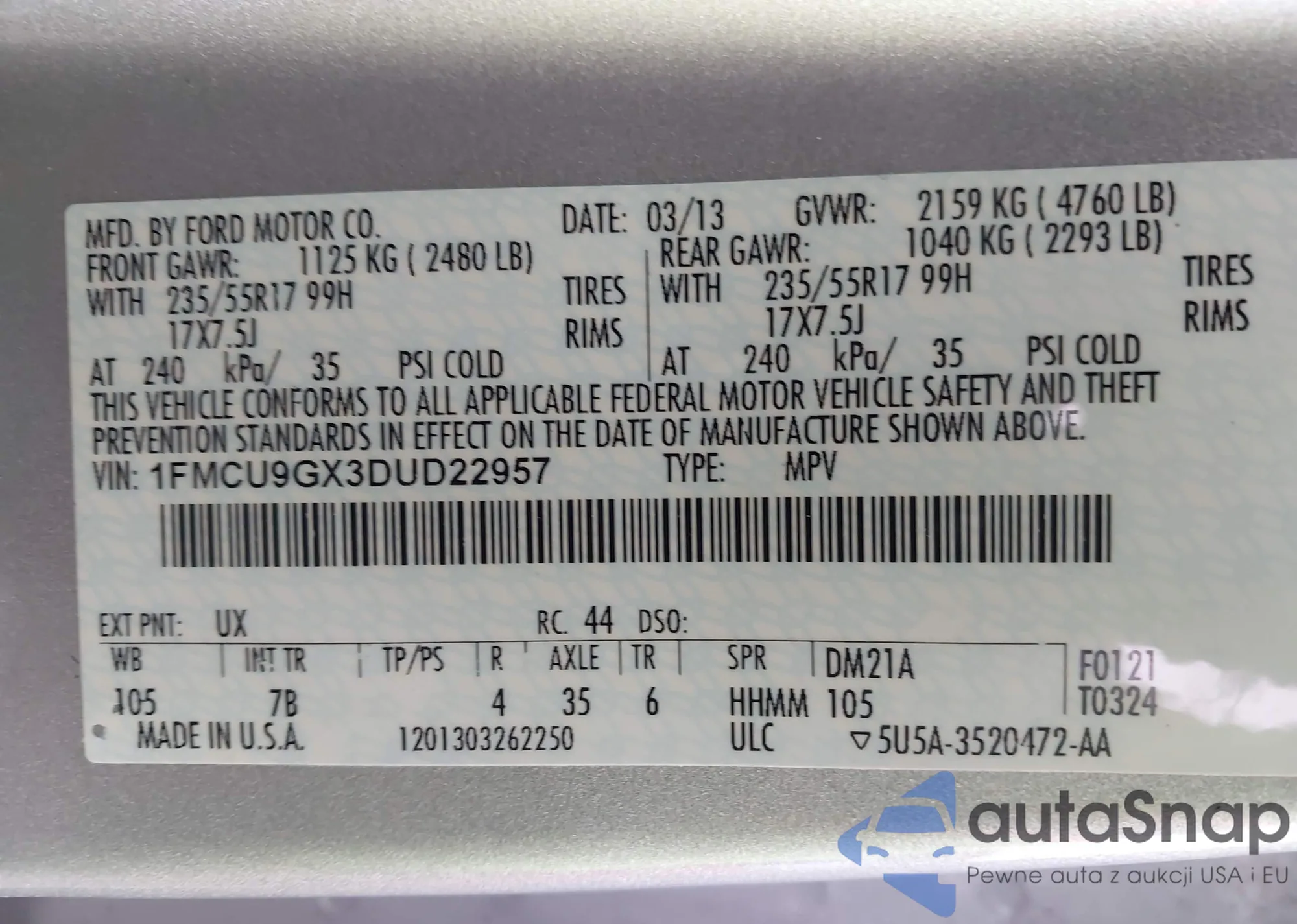 LOT: 43739584 VIN: 1FMCU9GX3DUD22957