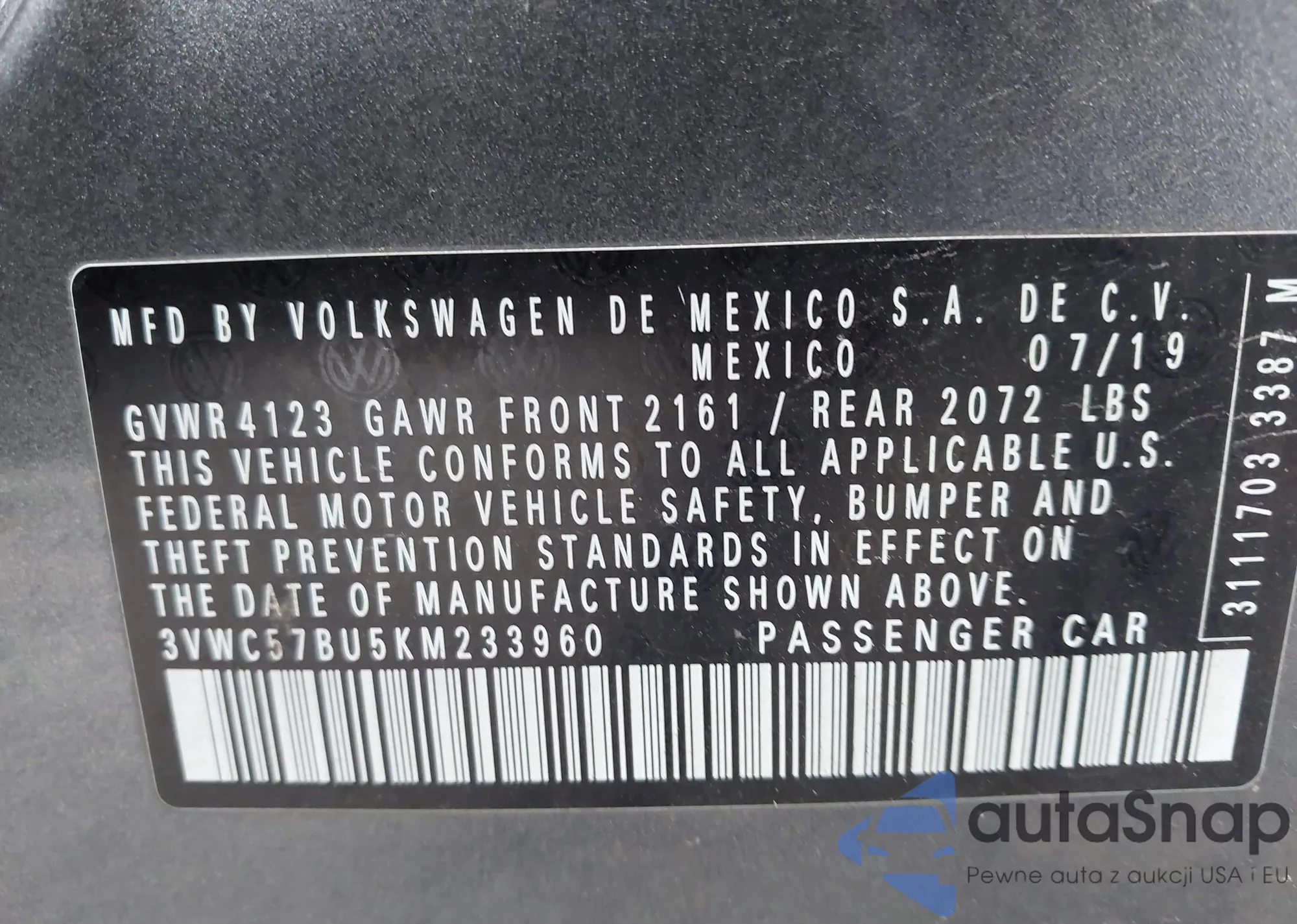 • VIN 3VWC57BU5KM233960