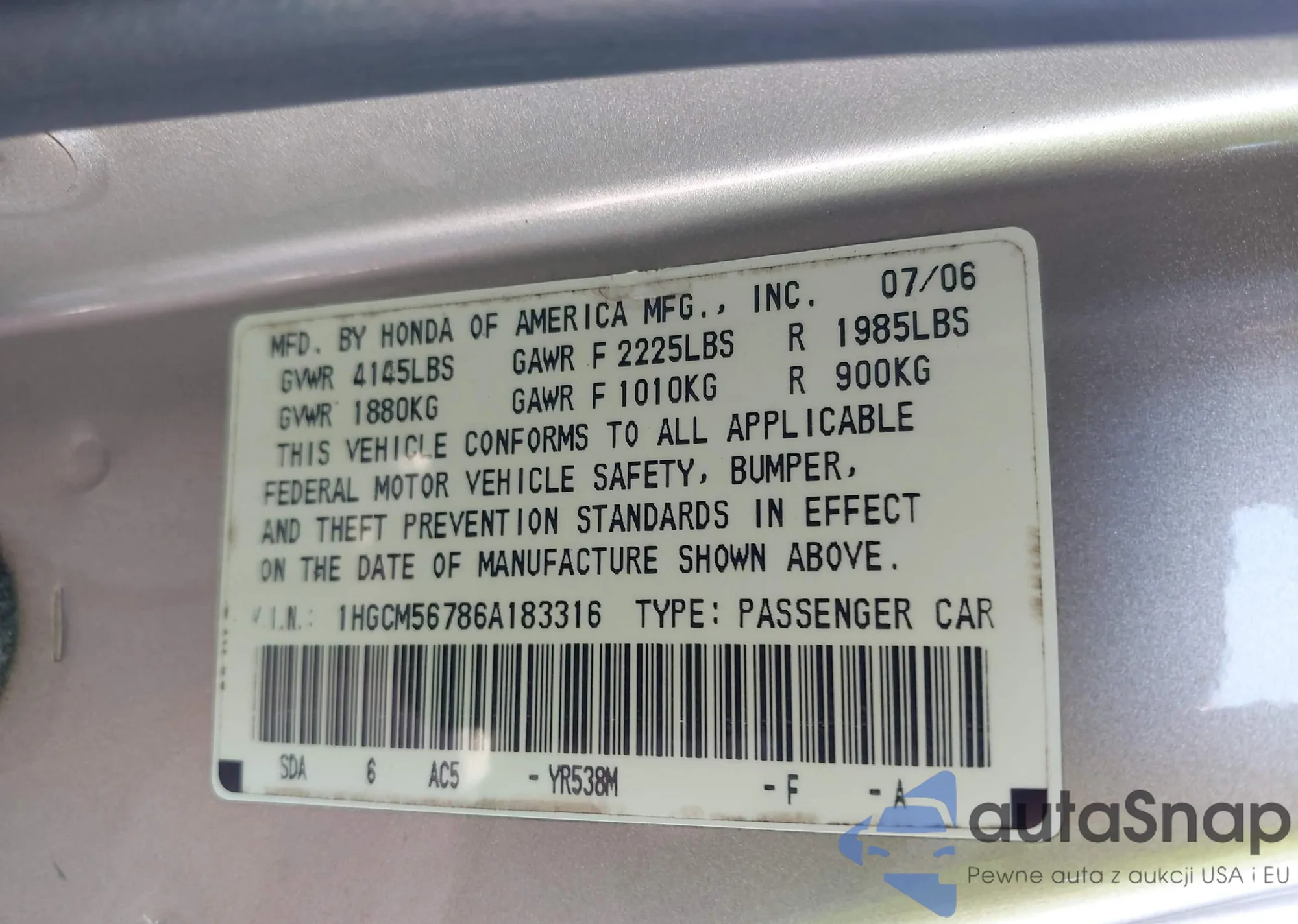 LOT: 43610426 VIN: 2HNYD18634H549189