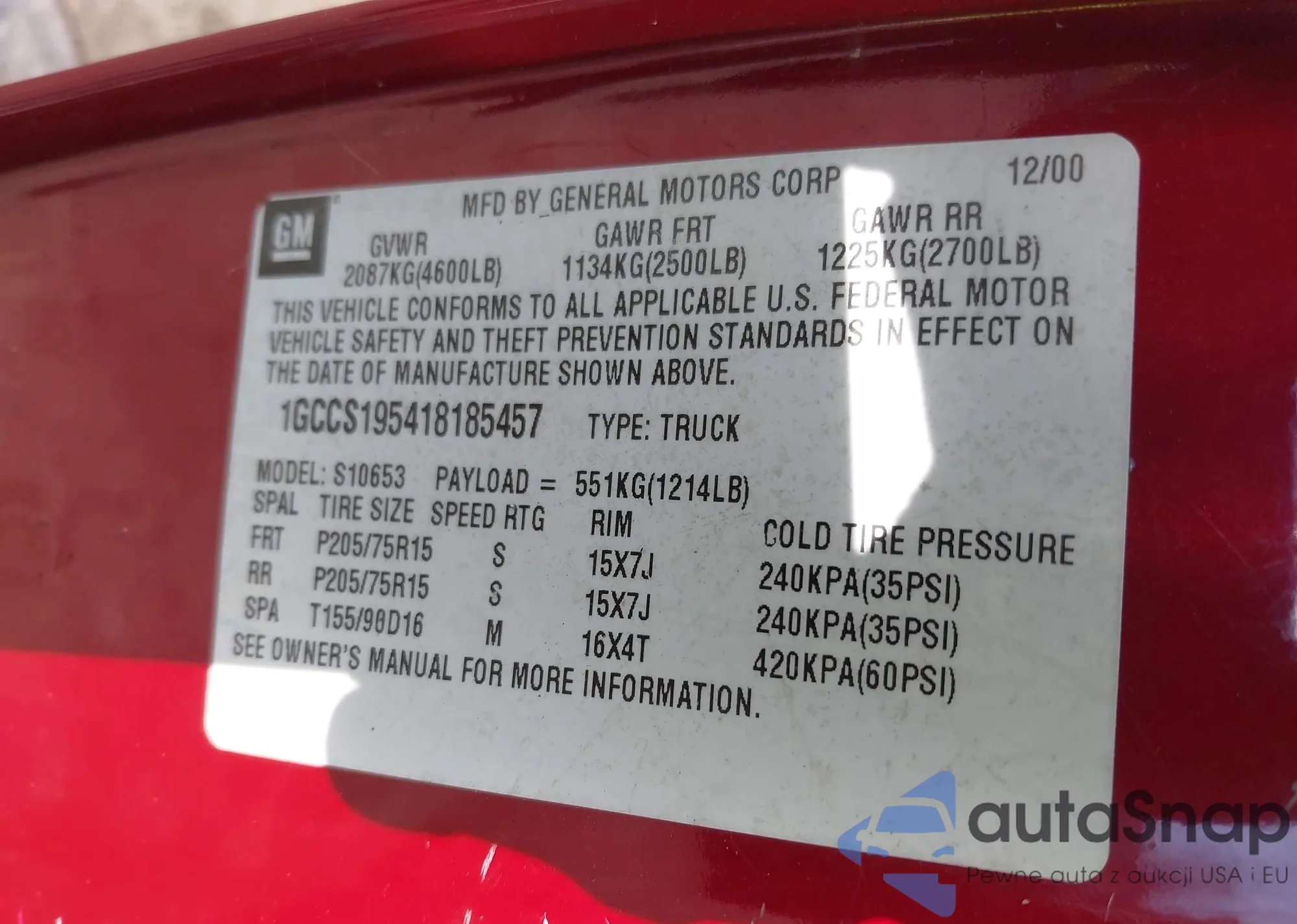 LOT: 43408670 VIN: 1GCCS195418185457