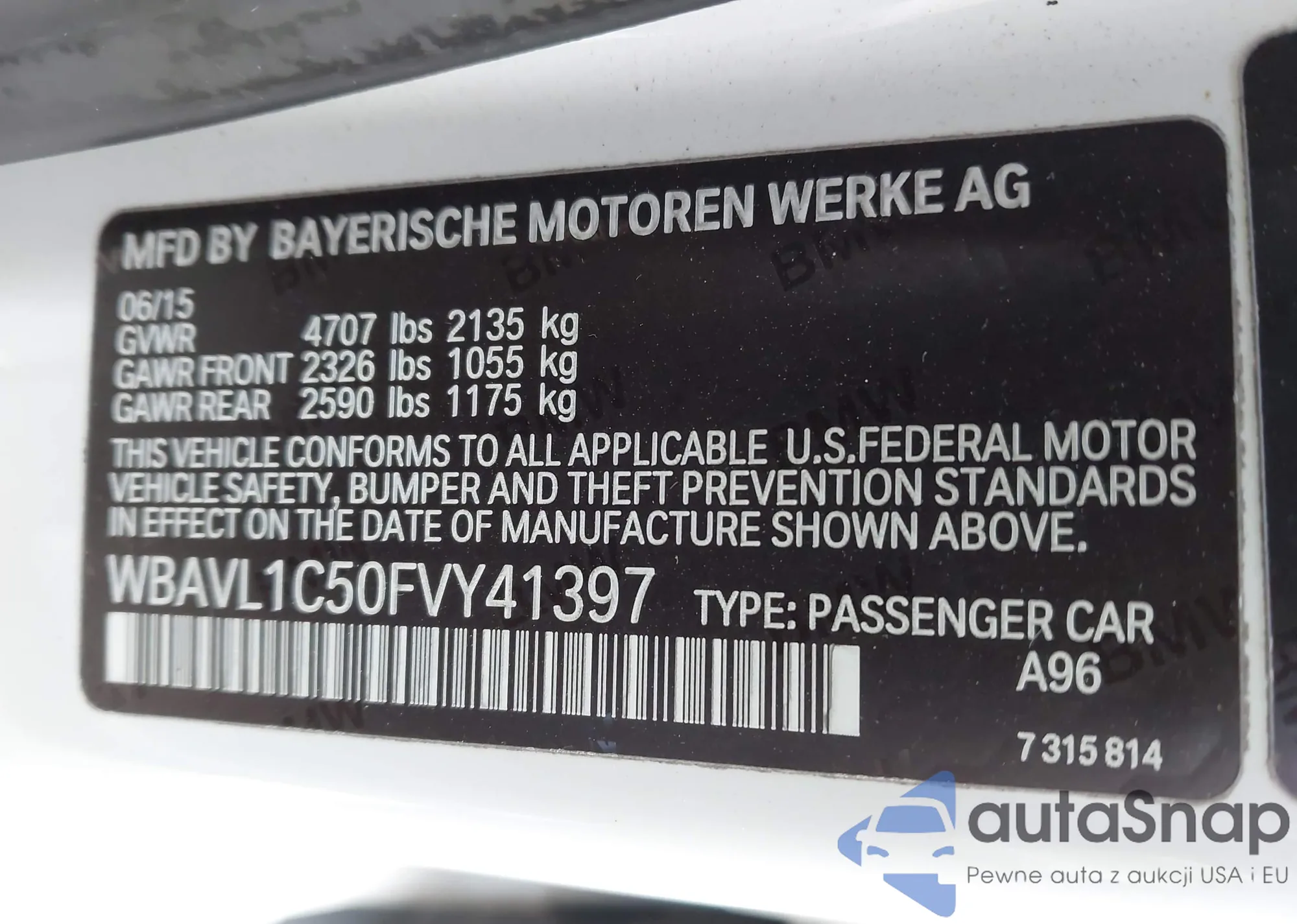 LOT: 43534301 VIN: WBAVL1C50FVY41397