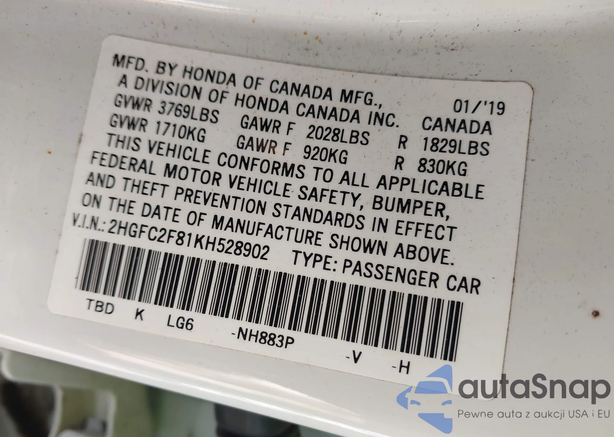 • VIN 2HGFC2F81KH528902