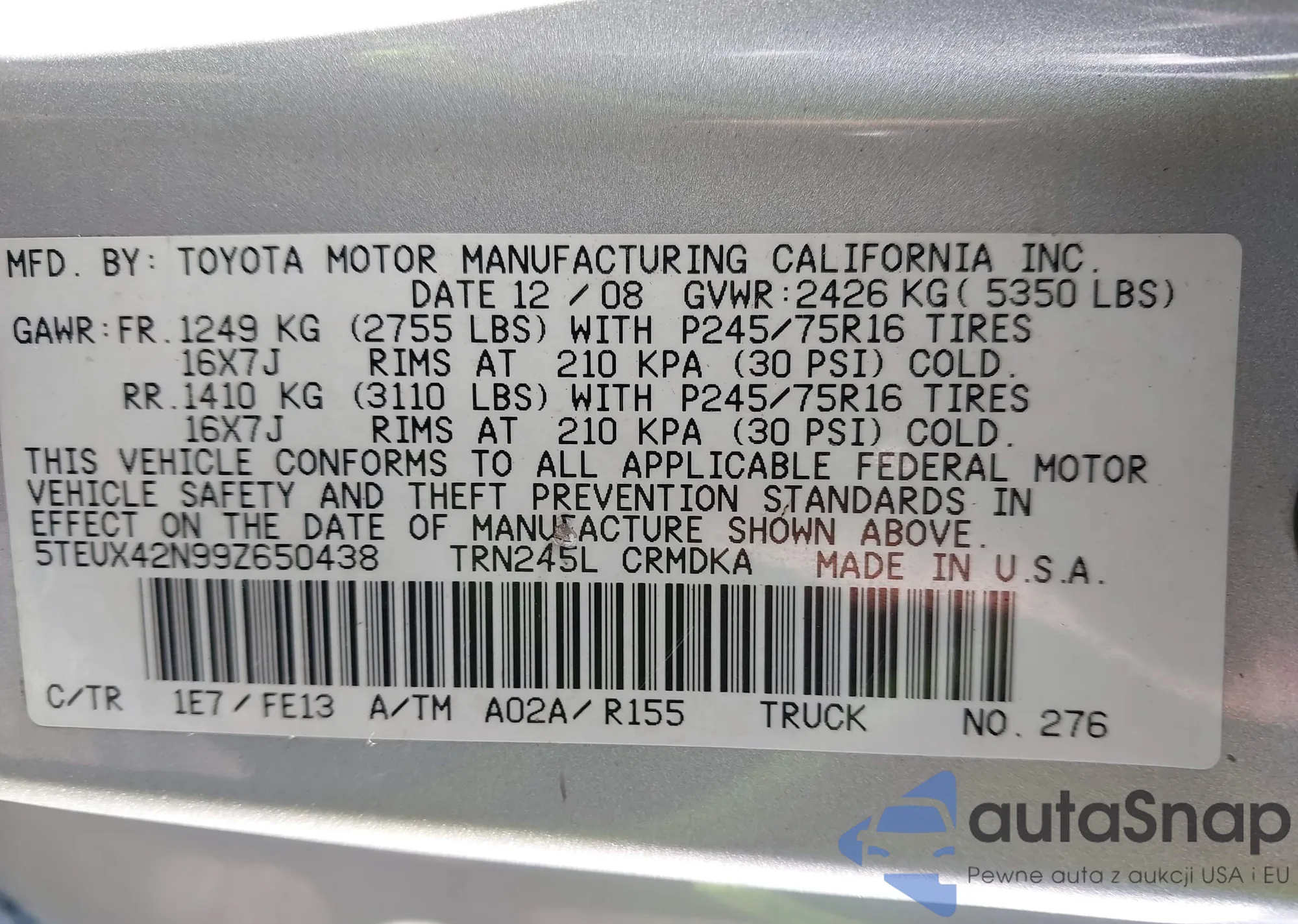 • VIN 5TEUX42N99Z650438