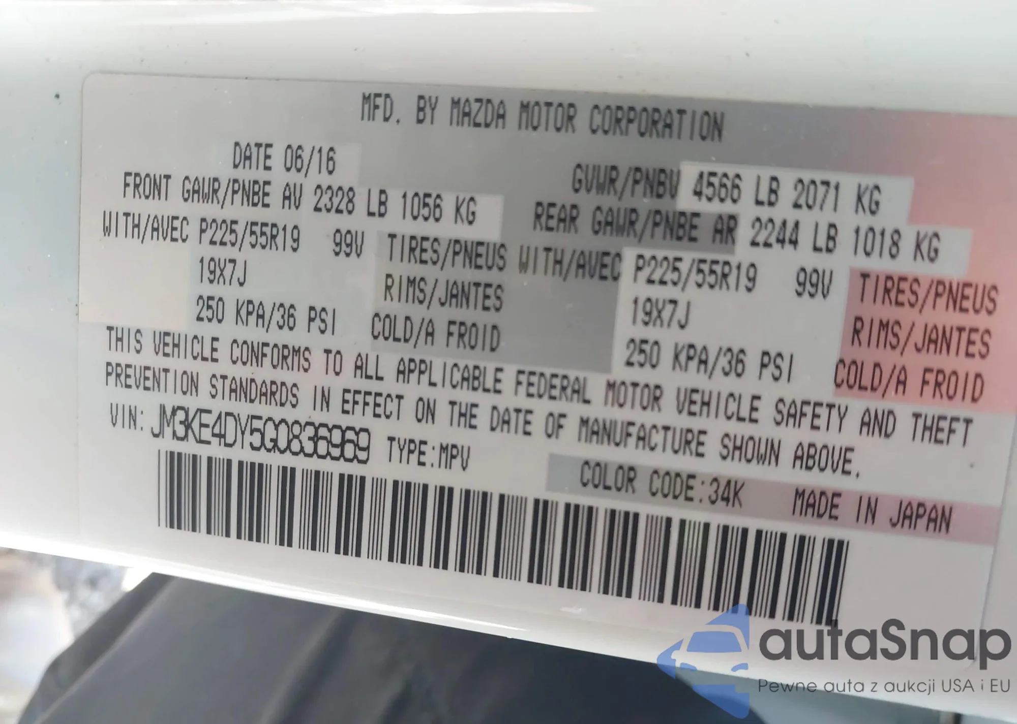 LOT: 43753354 VIN: JM3KE4DY5G0836969