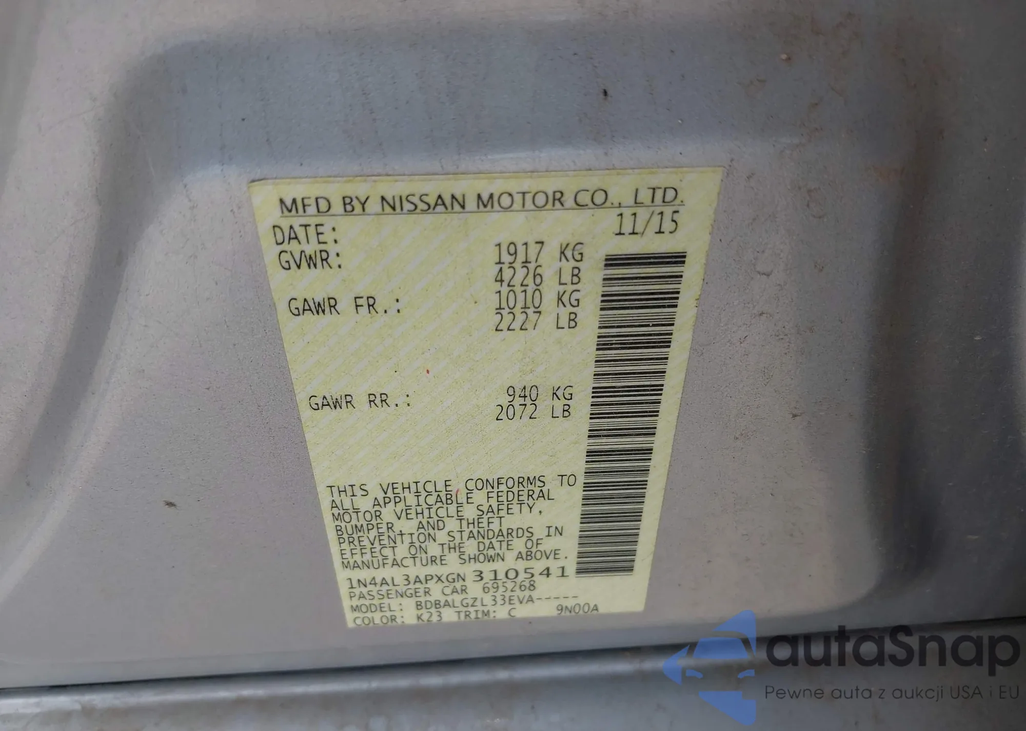 • VIN 1N4AL3APXGN310541