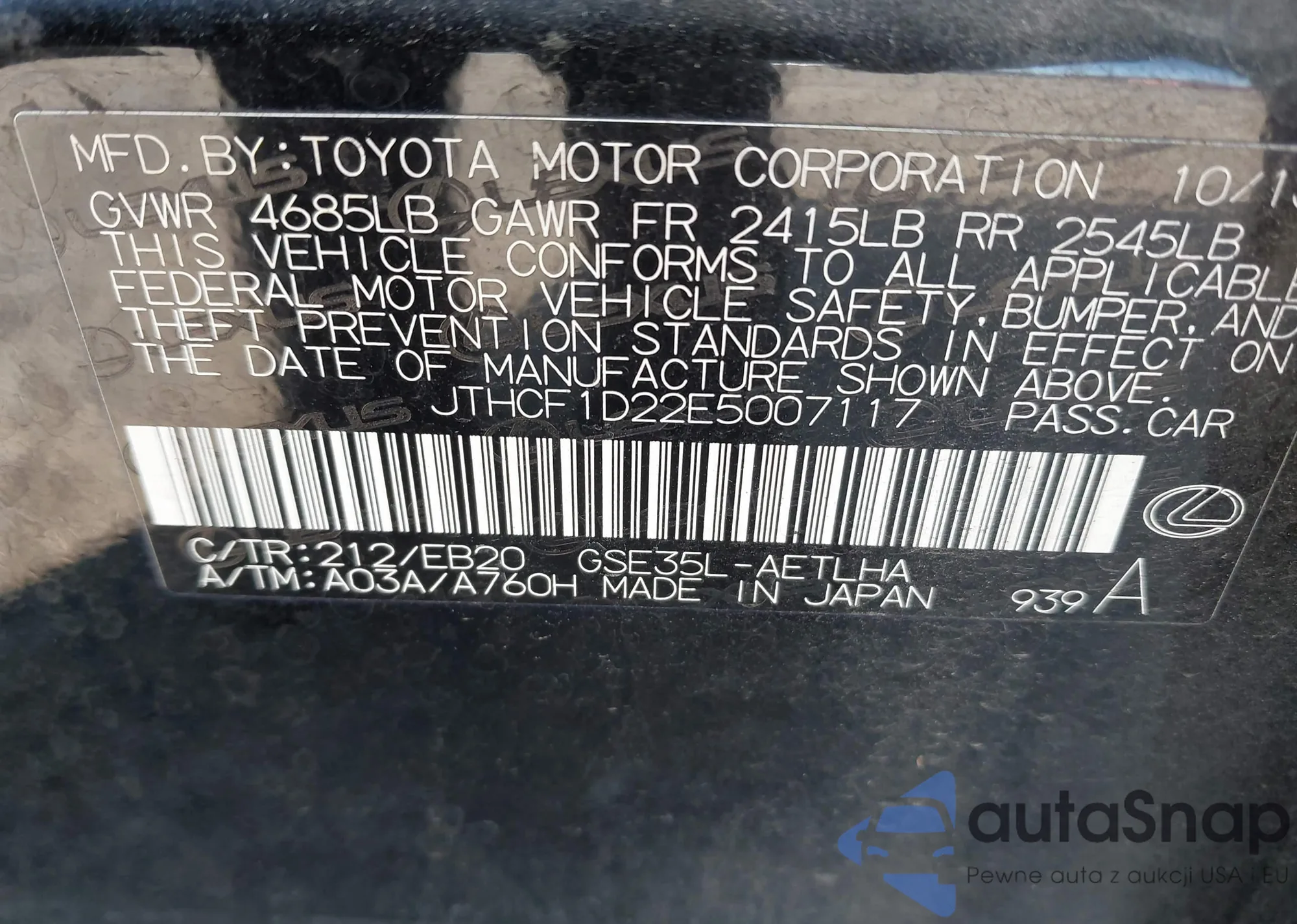 LOT: 42818482 VIN: JTHCF1D22E5007117