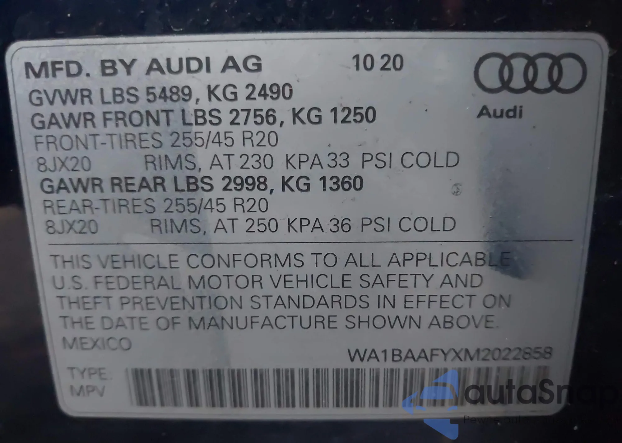 LOT: 43622462 VIN: WA1BAAFYXM2022858