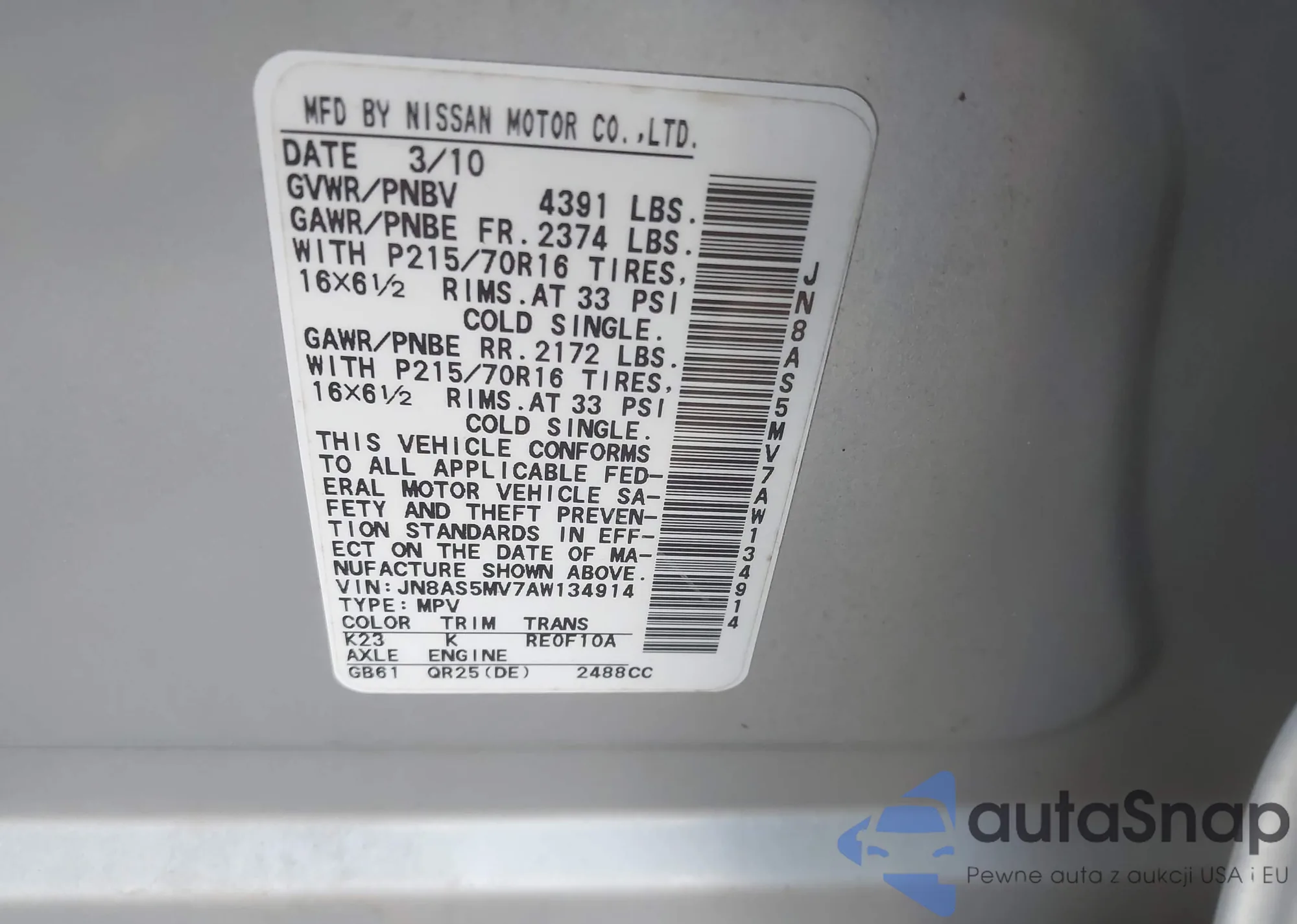• VIN JN8AS5MV7AW134914