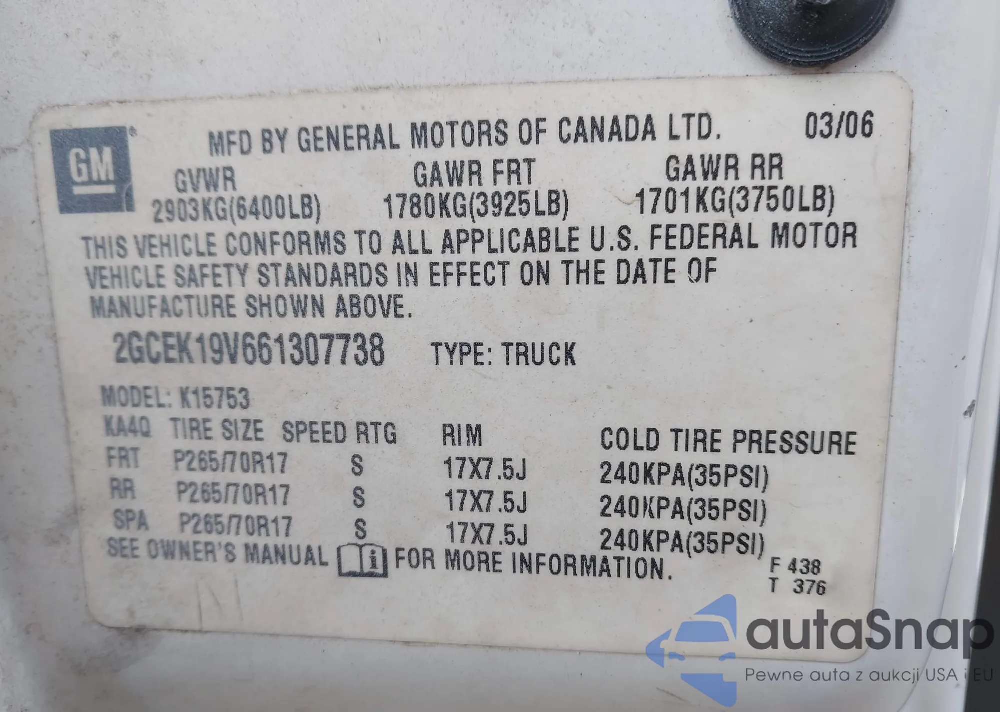 • VIN 2GCEK19V661307738