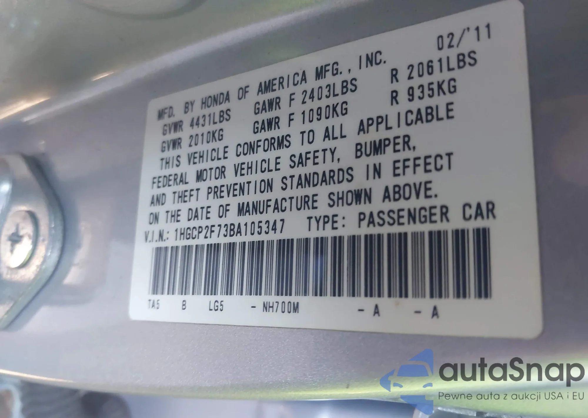 LOT: 43809608 VIN: 1HGCP2F73BA105347