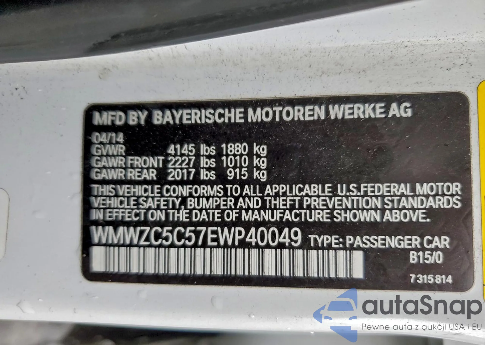 LOT: 93749245 VIN: WMWZC5C57EWP40049