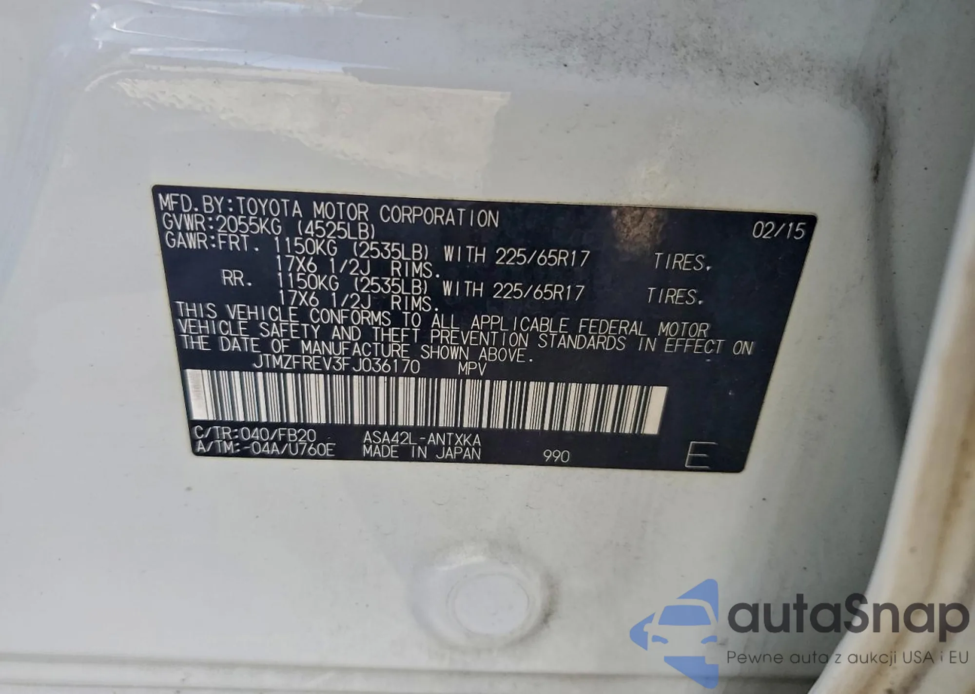 LOT: 94572305 VIN: JTMZFREV3FJ036170
