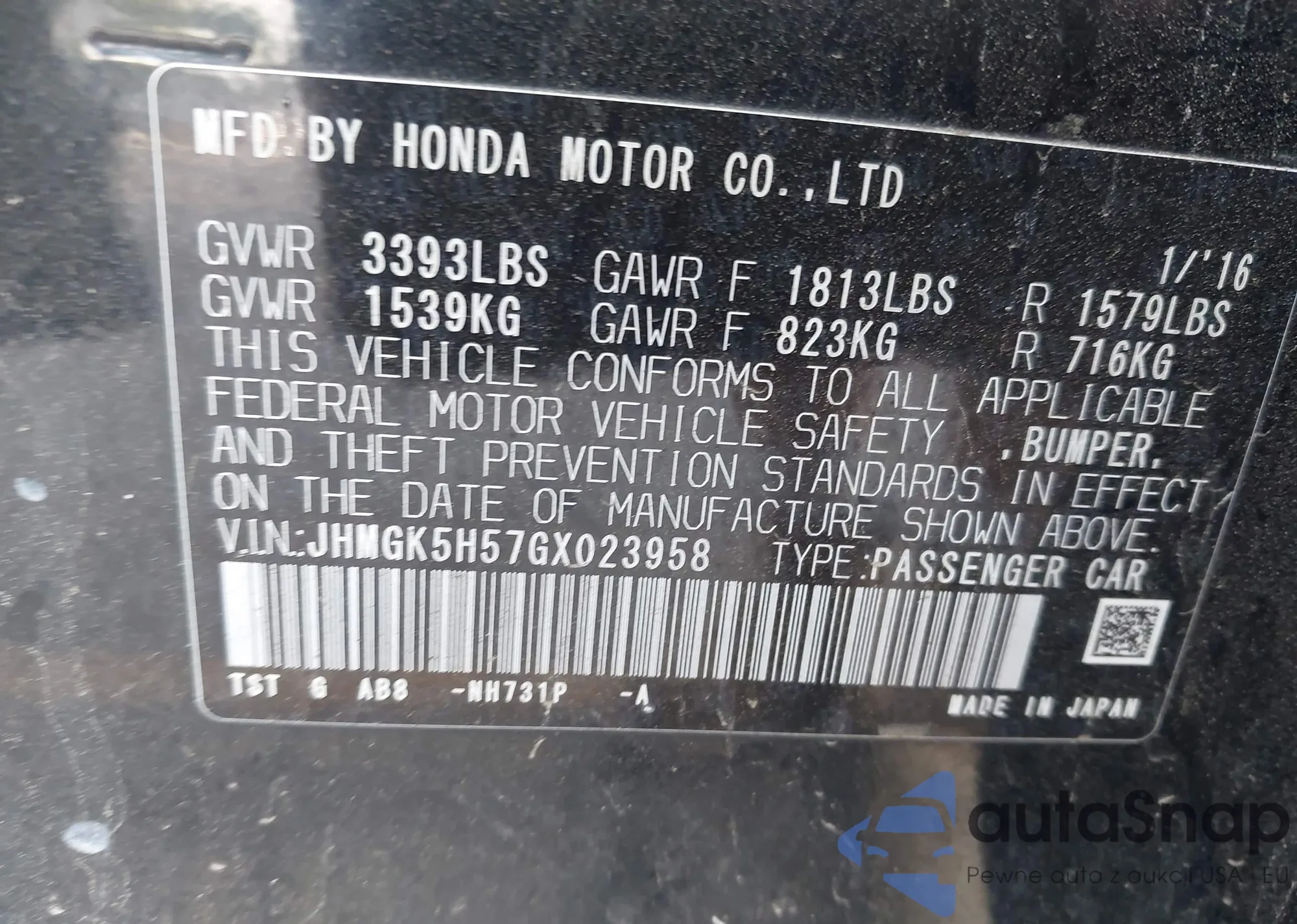 LOT: 42982600 VIN: JHMGK5H57GX023958