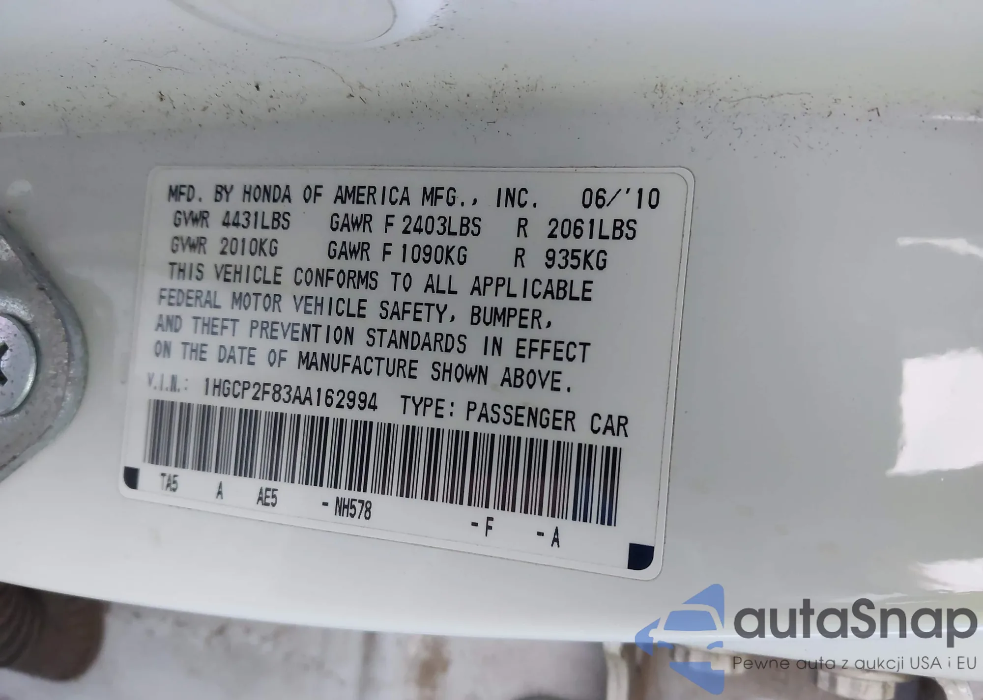 LOT: 43488291 VIN: 1HGCP2F83AA162994