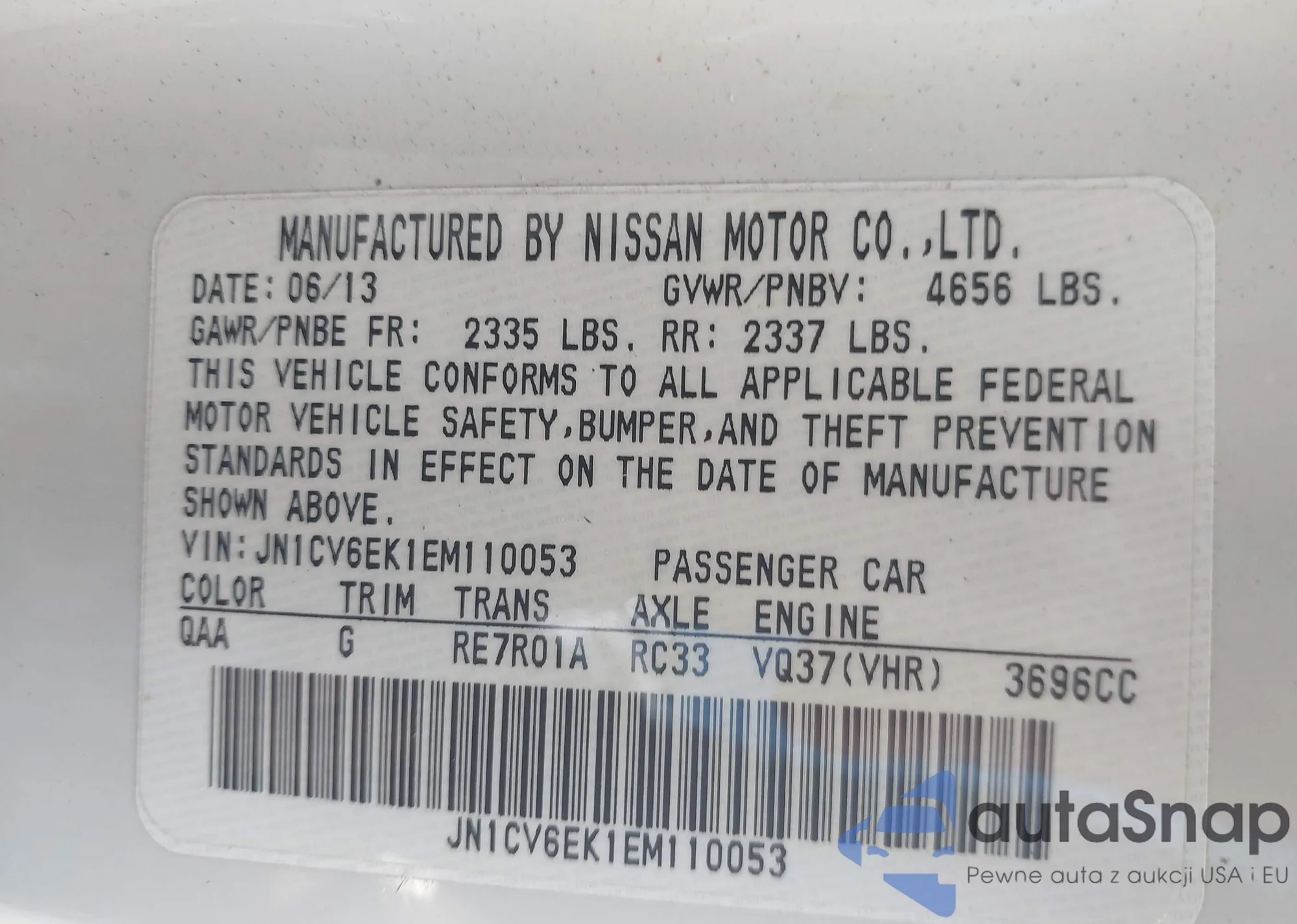 LOT: 43534536 VIN: JN1CV6EK1EM110053
