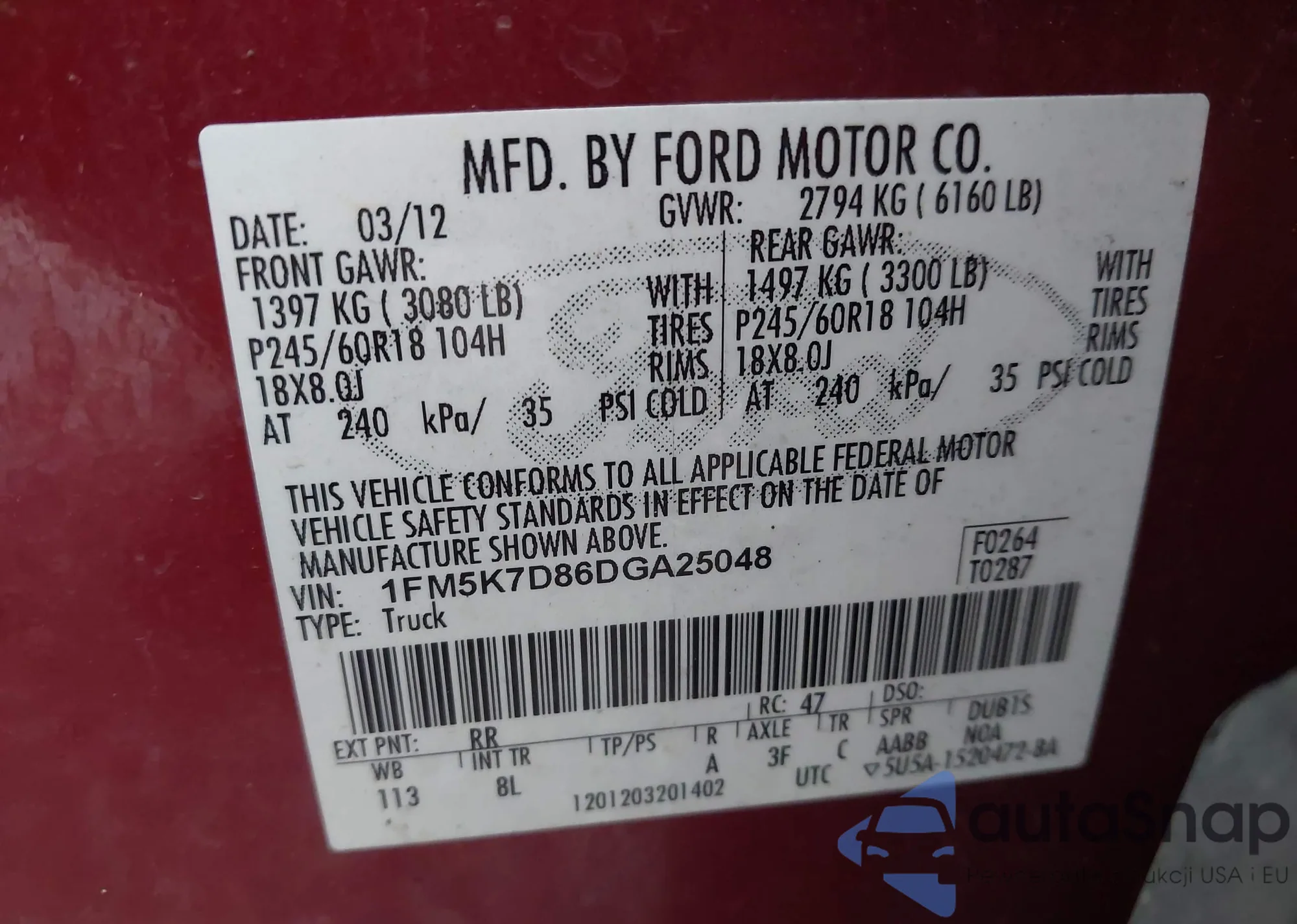 LOT: 42706499 VIN: 2FMPK4J80JBC15751