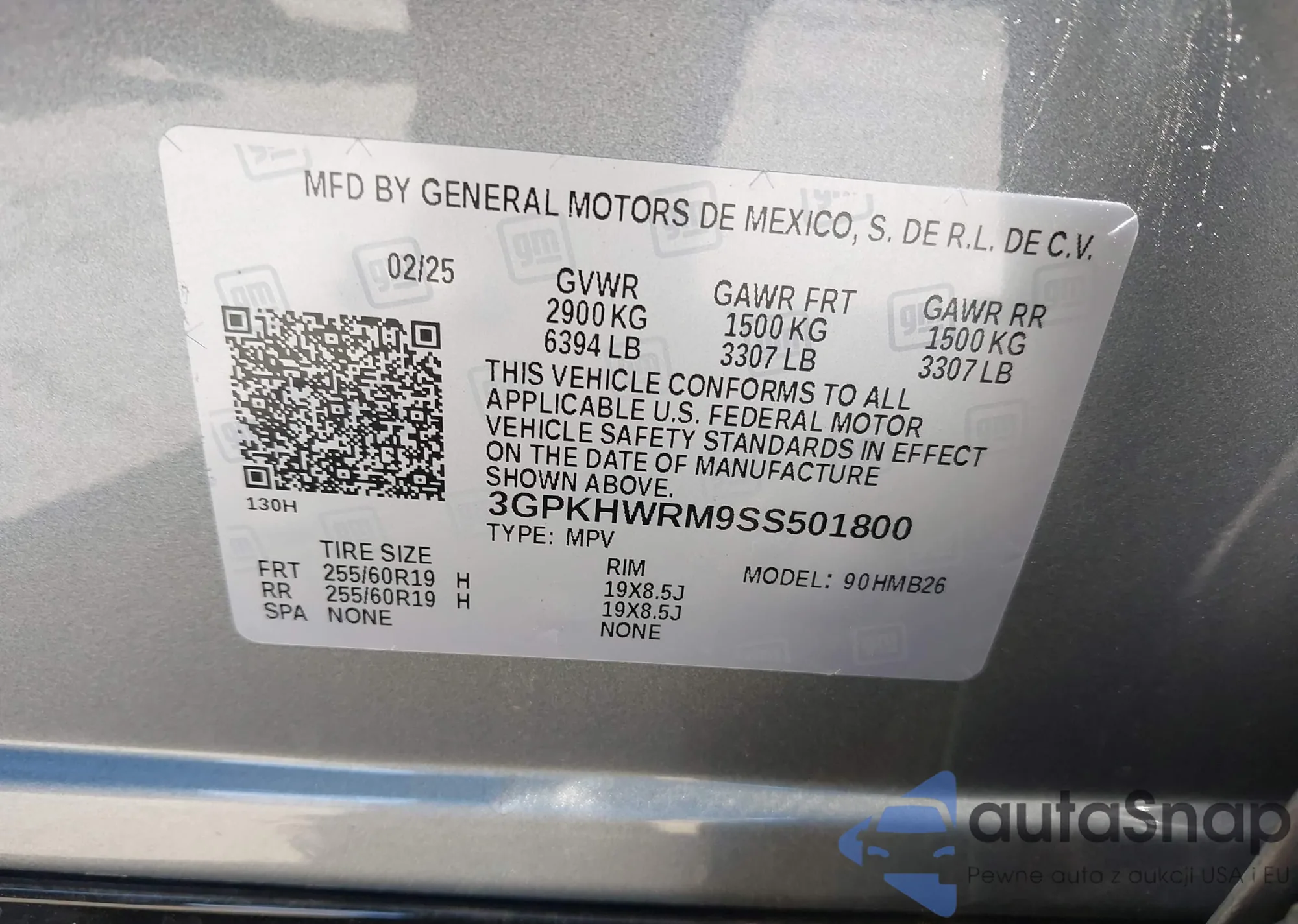 LOT: 43643340 VIN: 3GPKHWRM9SS501800