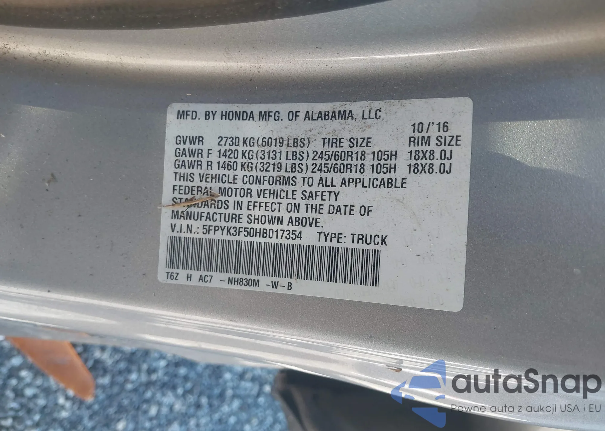 • VIN 5FPYK3F50HB017354
