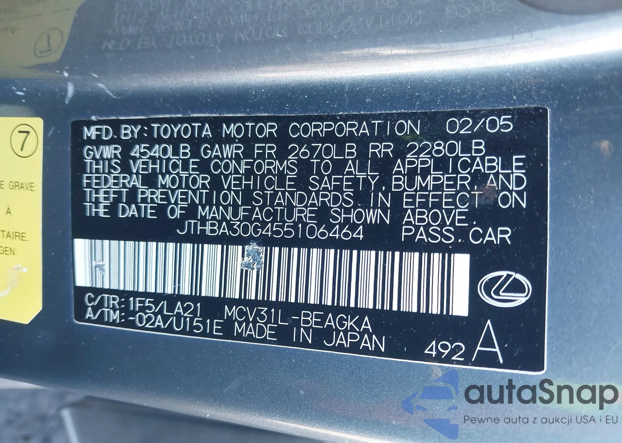 LOT: 43745204 VIN: JTHBA30G455106464