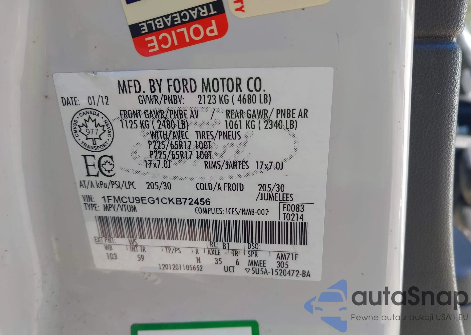 • VIN 1FMCU9EG1CKB72456