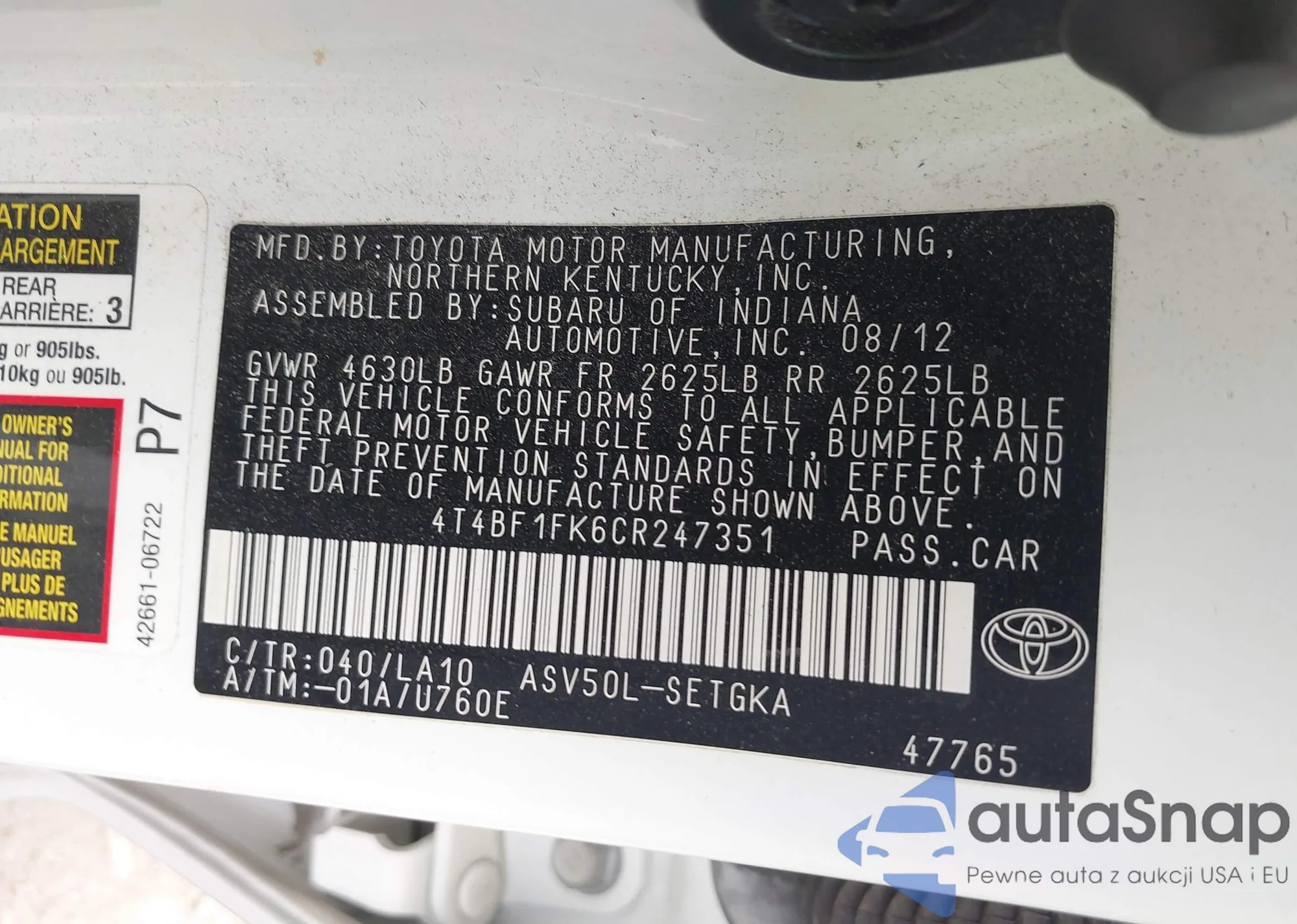 • VIN 4T4BF1FK6CR247351