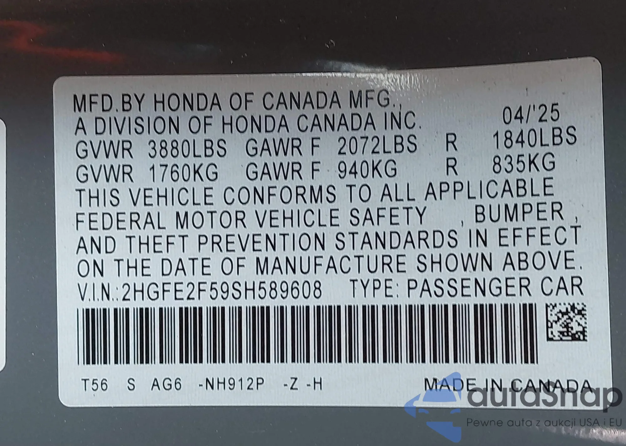 LOT: 43226075 VIN: 2HGFE2F59SH589608
