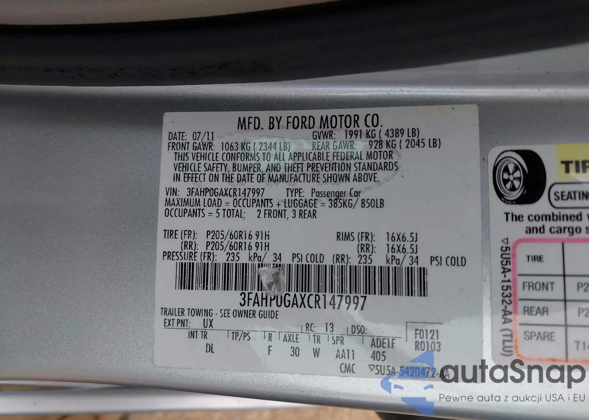 LOT: 43265320 VIN: 3FAHP0GAXCR147997