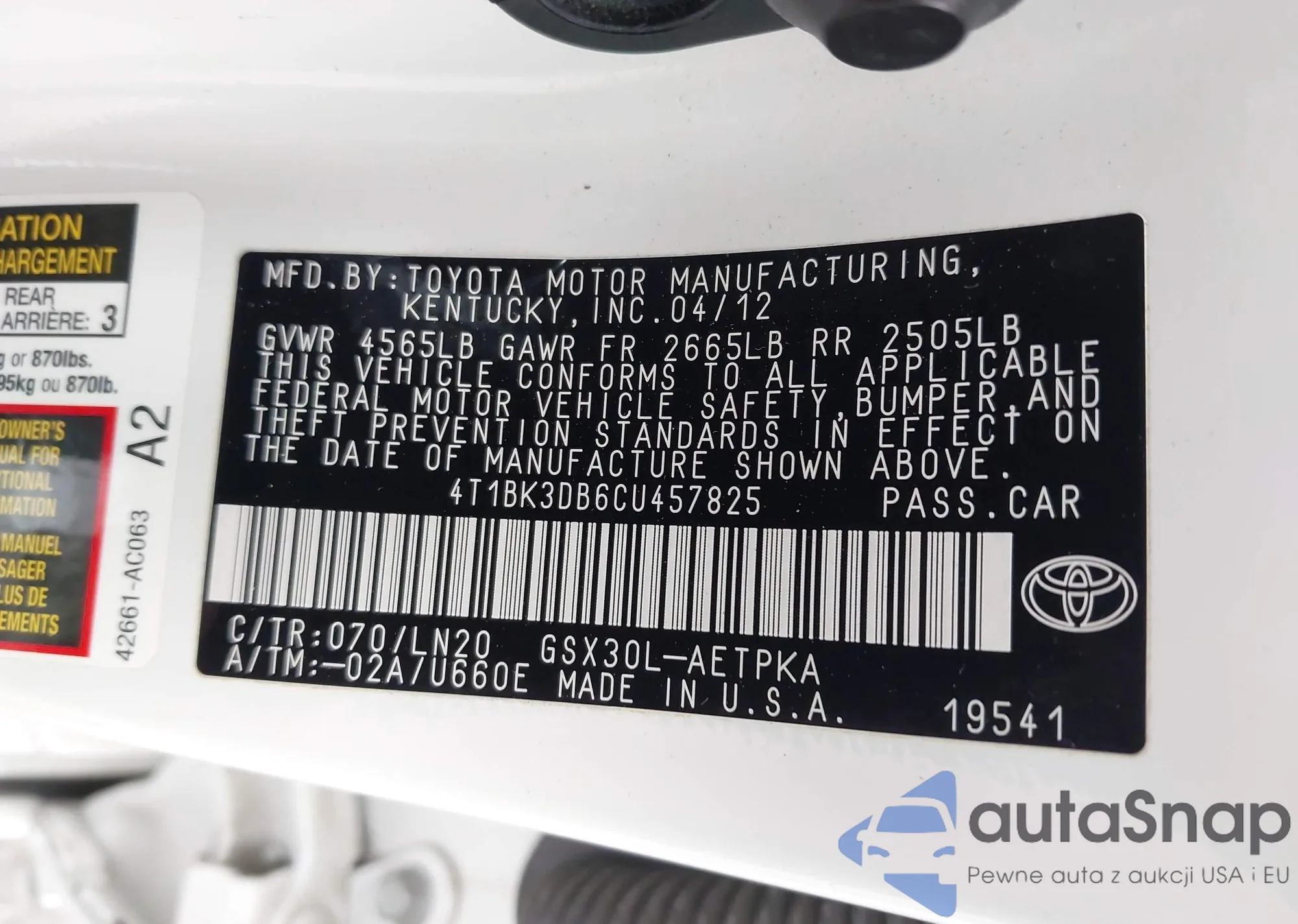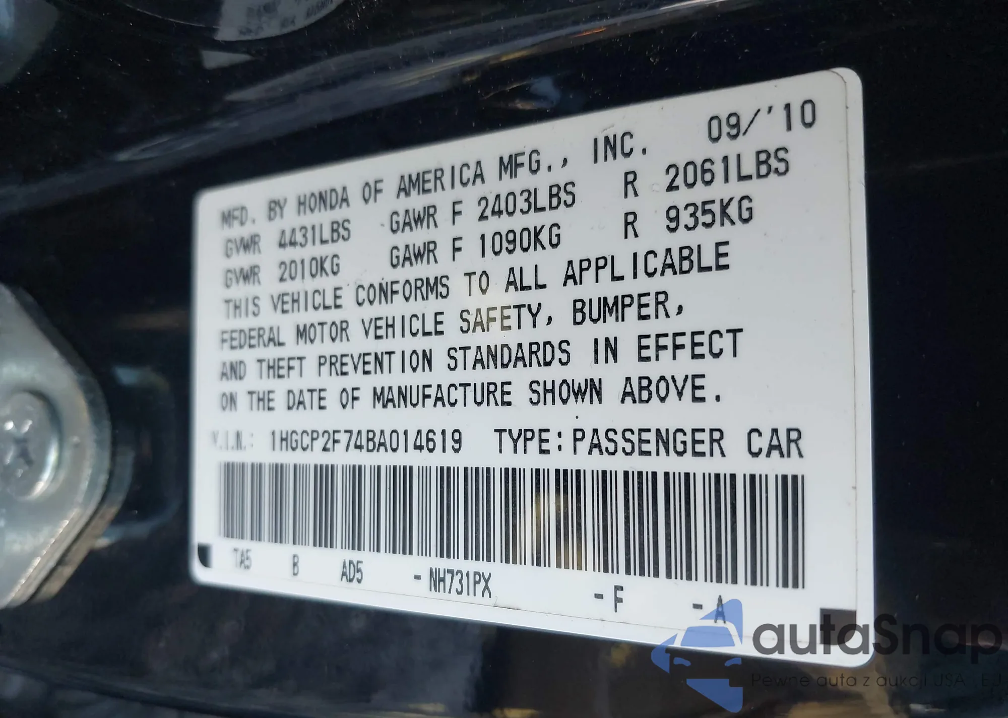 LOT: 43638053 VIN: 1HGCP2F74BA014619
