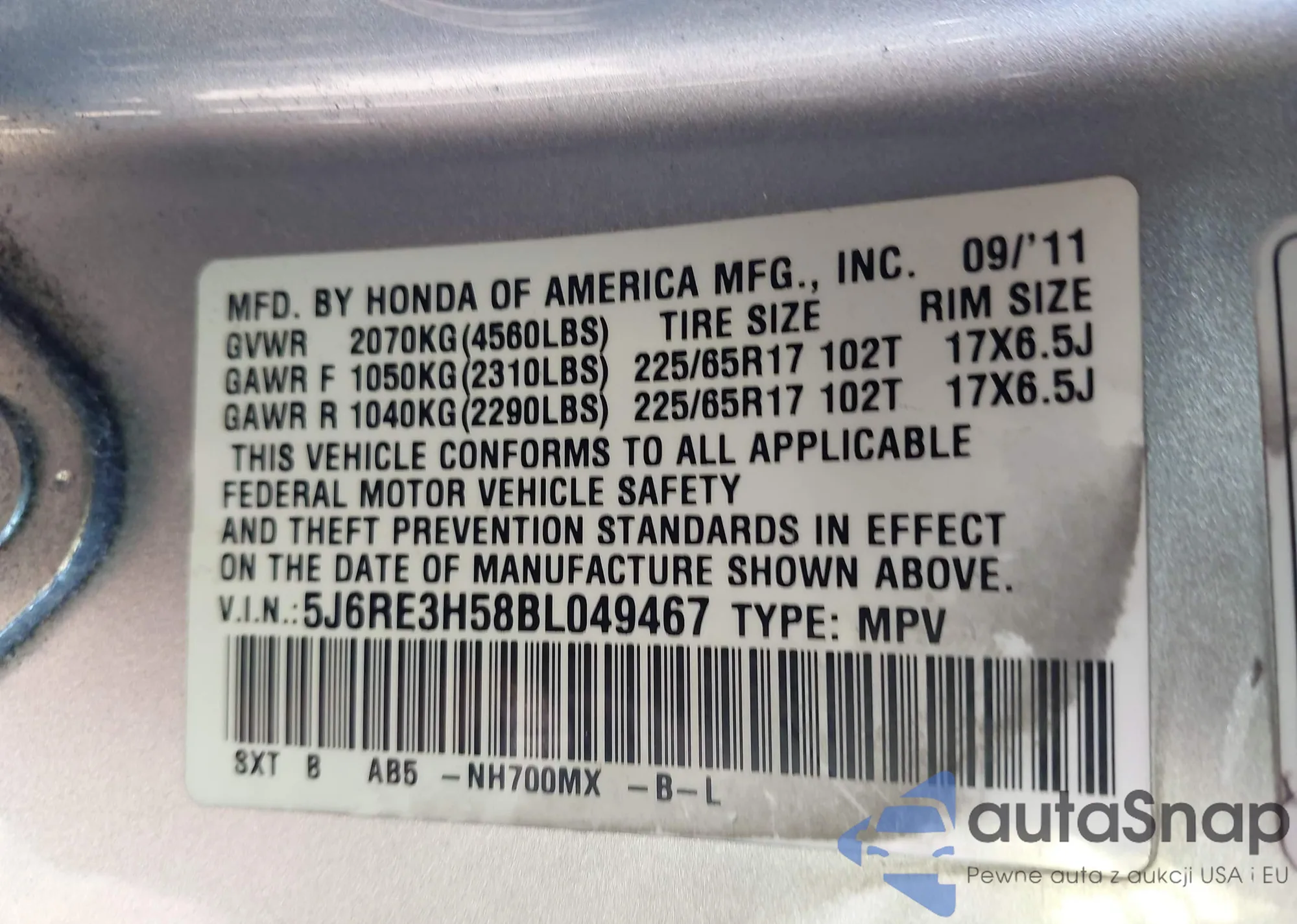 • VIN 5J6RE3H58BL049467