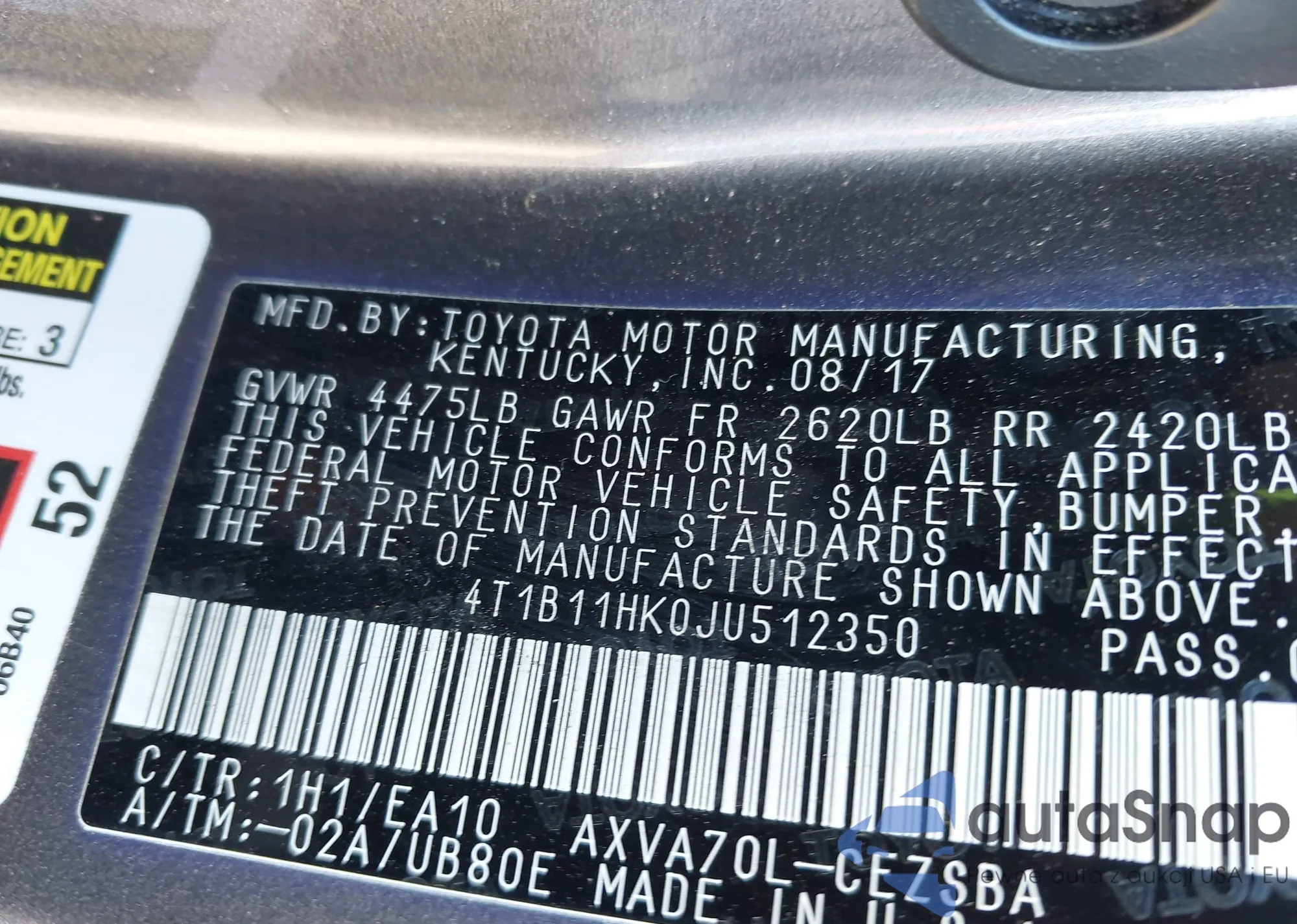 LOT: 43600833 VIN: 4T1B11HK0JU512350