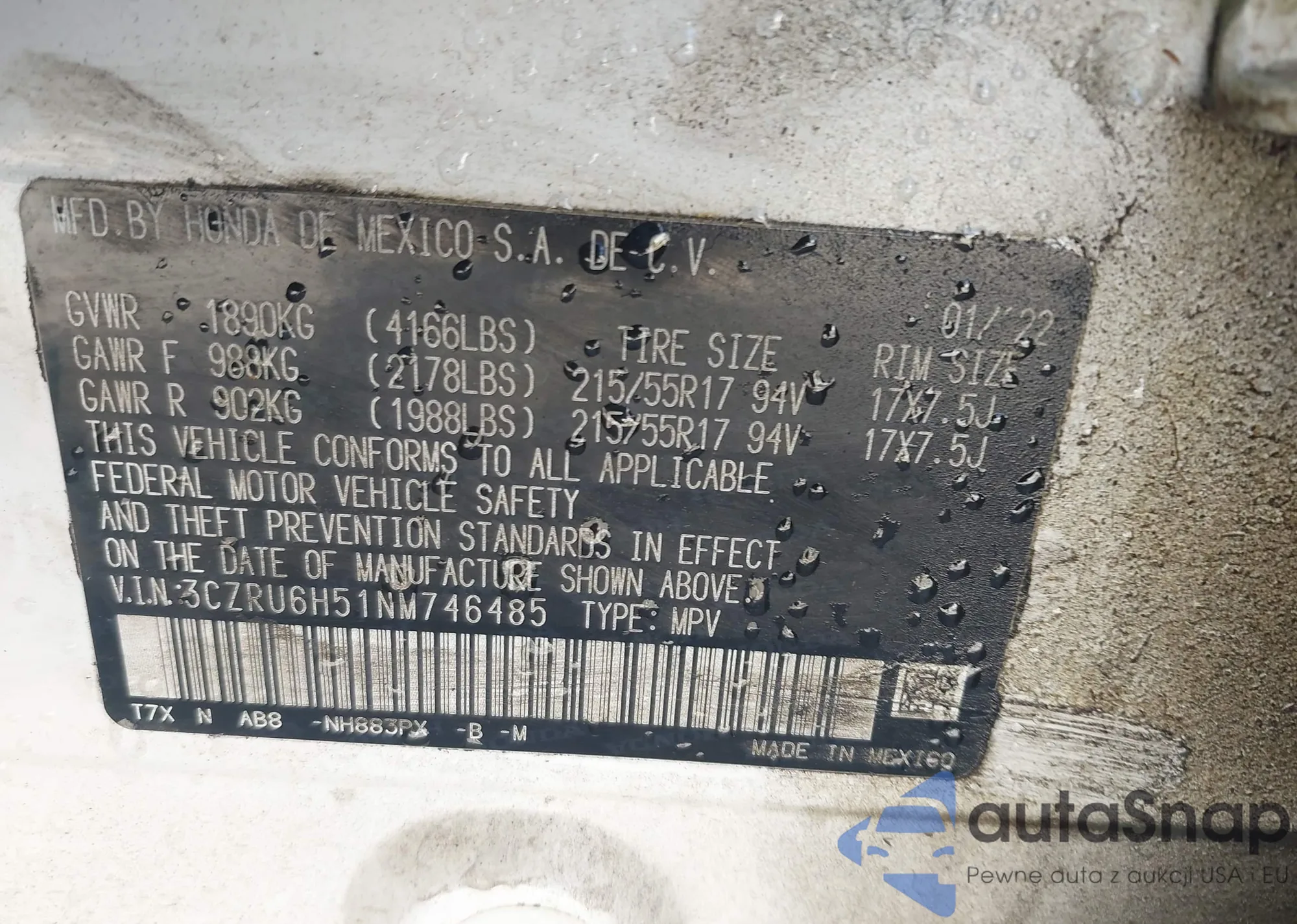 • VIN 3CZRU6H51NM746485