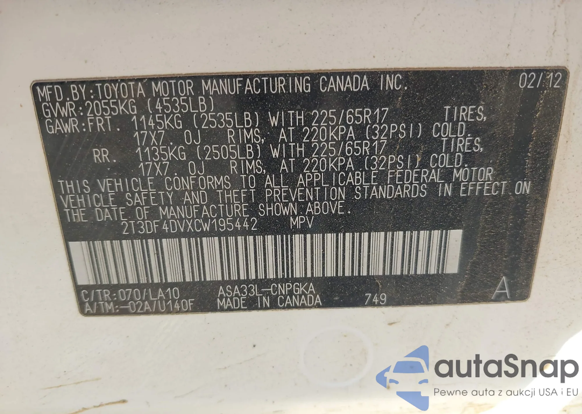 LOT: 43604120 VIN: 2T3DF4DVXCW195442
