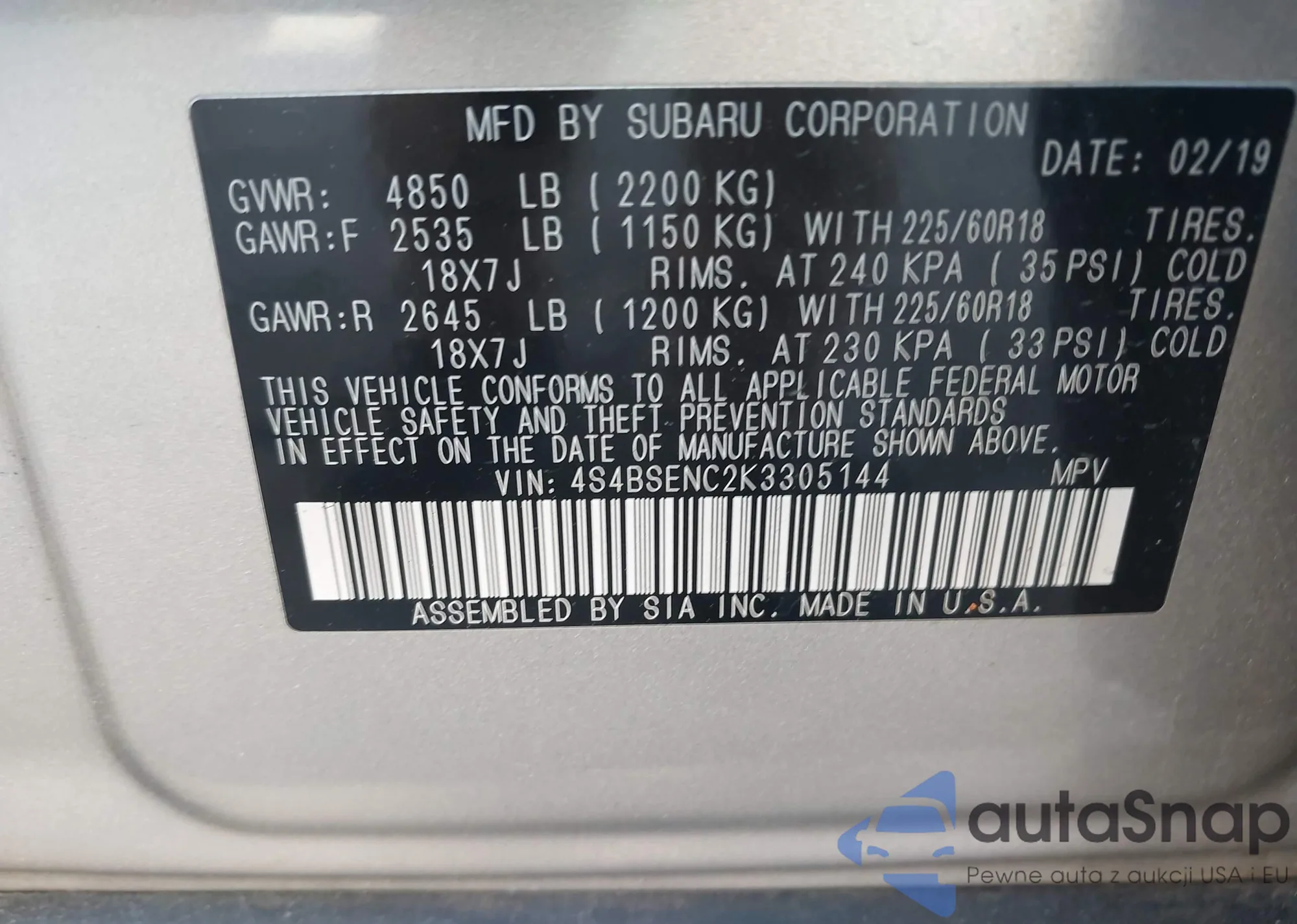 LOT: 43611635 VIN: 4S4BSENC2K3305144