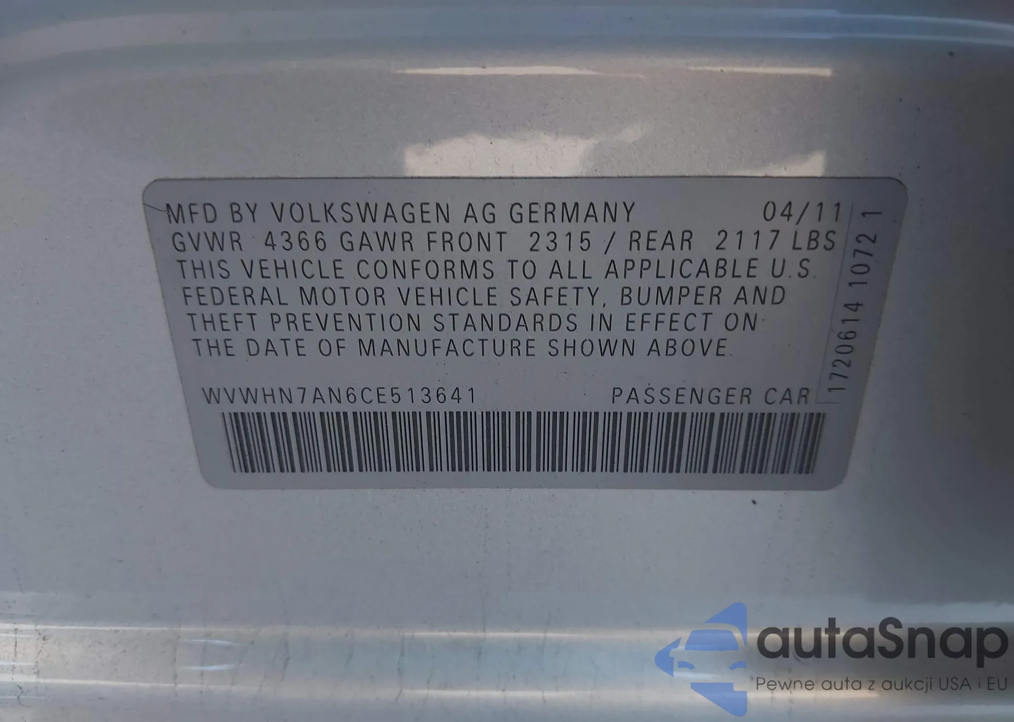 LOT: 43618757 VIN: WVWHN7AN6CE513641
