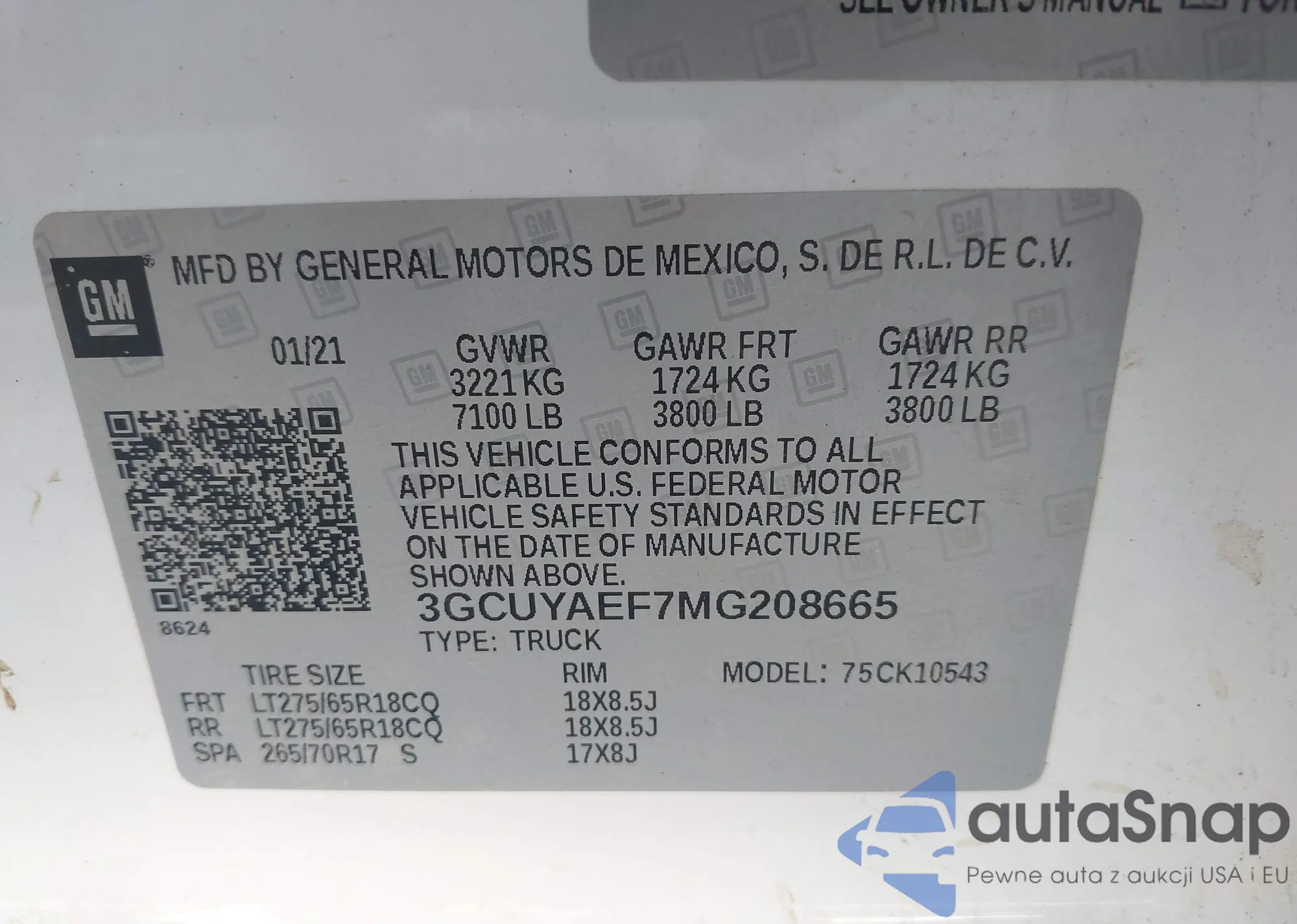 LOT: 43621044 VIN: 3GCUYAEF7MG208665