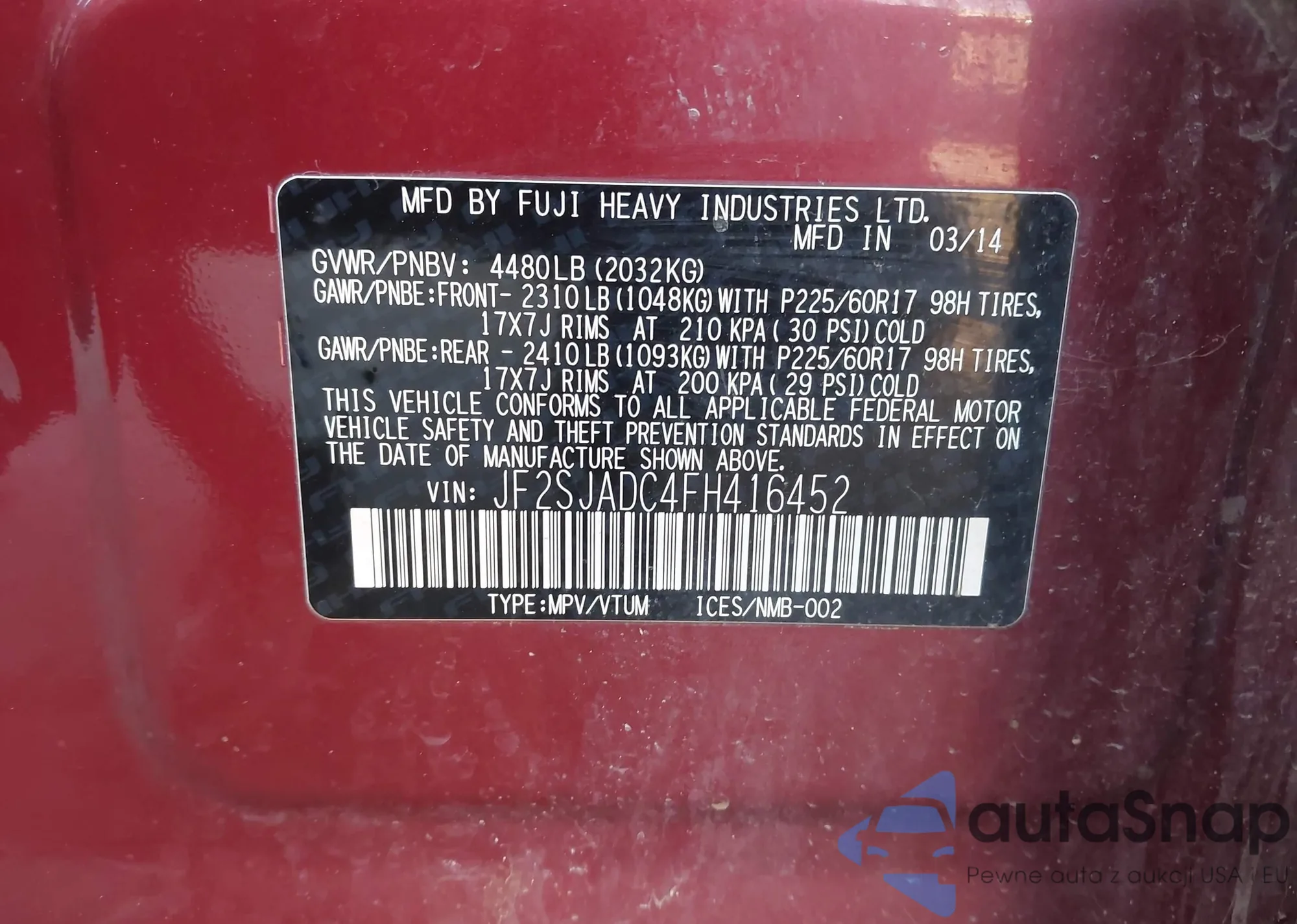 • VIN JF2SJADC4FH416452