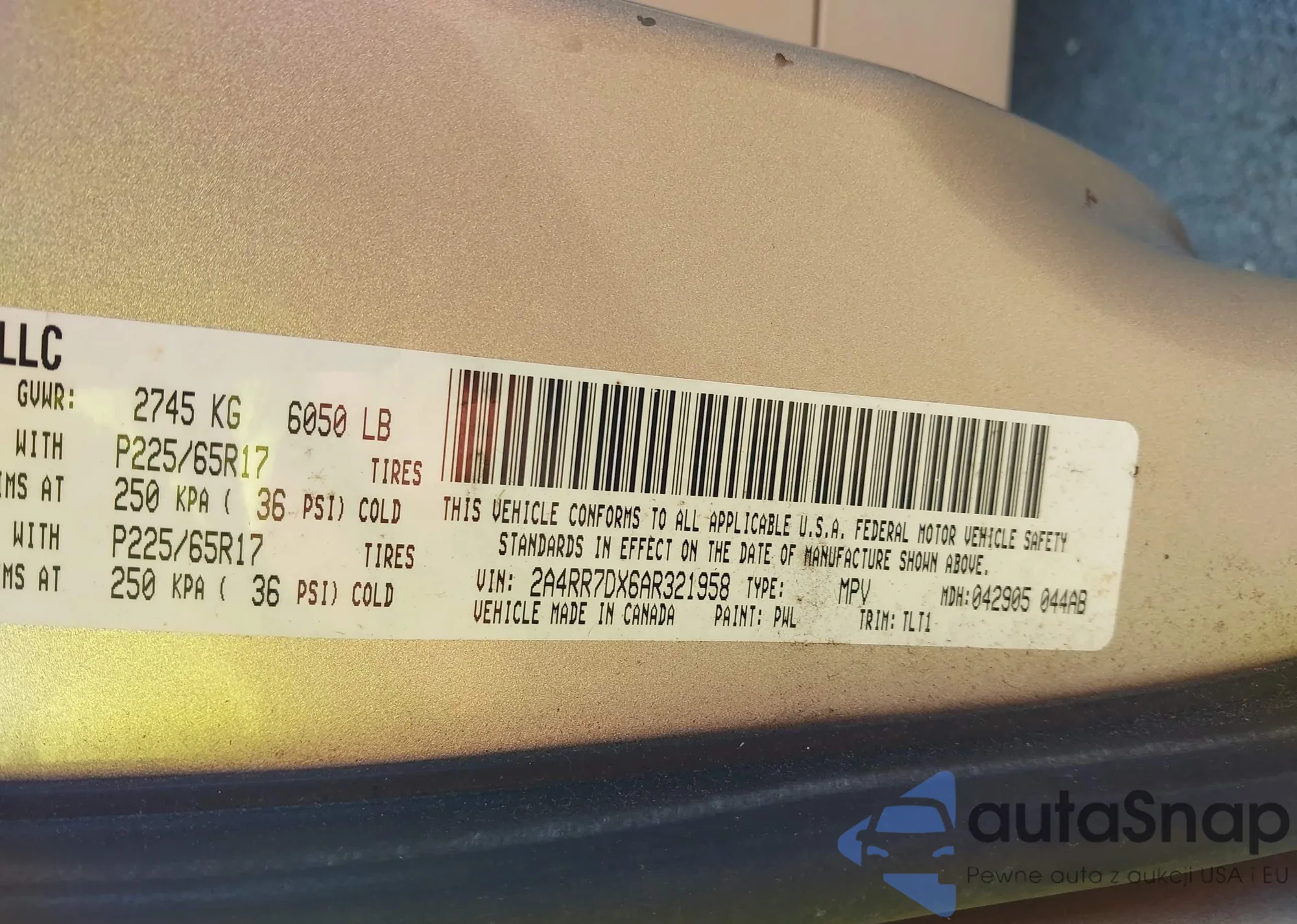 • VIN 2A4RR7DX6AR321958