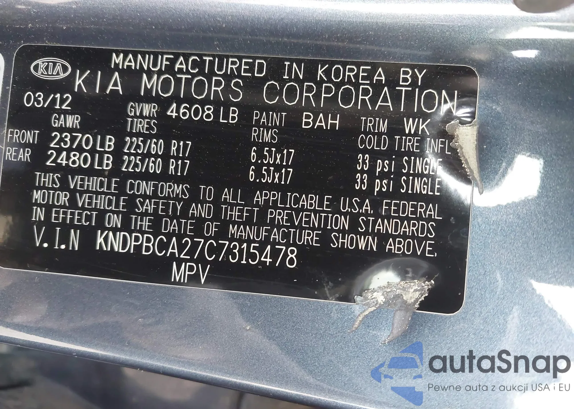 LOT: 43617818 VIN: KNAFX4A69F5321060