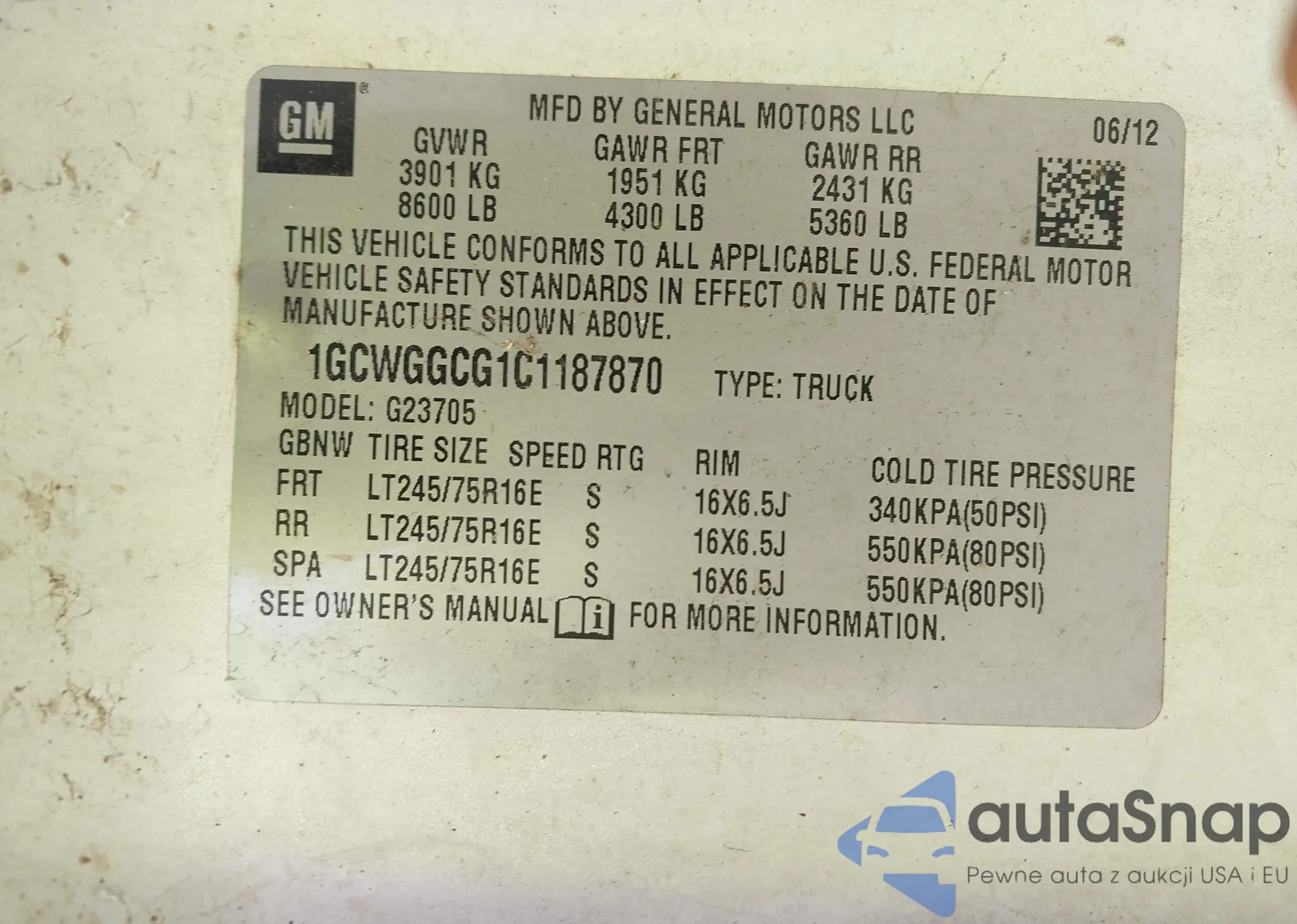 LOT: 43602855 VIN: 1GCWGGCG1C1187870