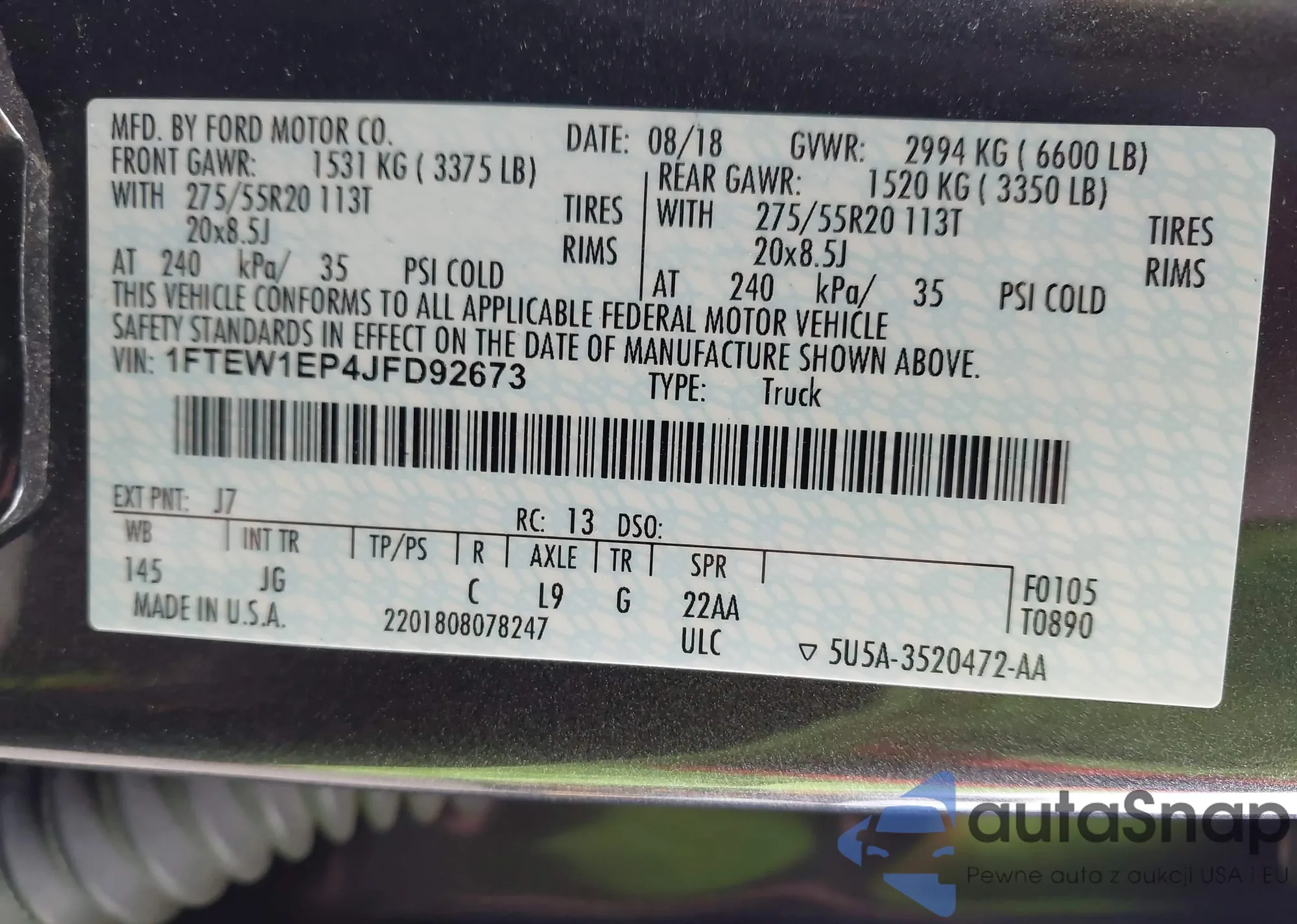 LOT: 43528980 VIN: 1FTEW1EP4JFD92673