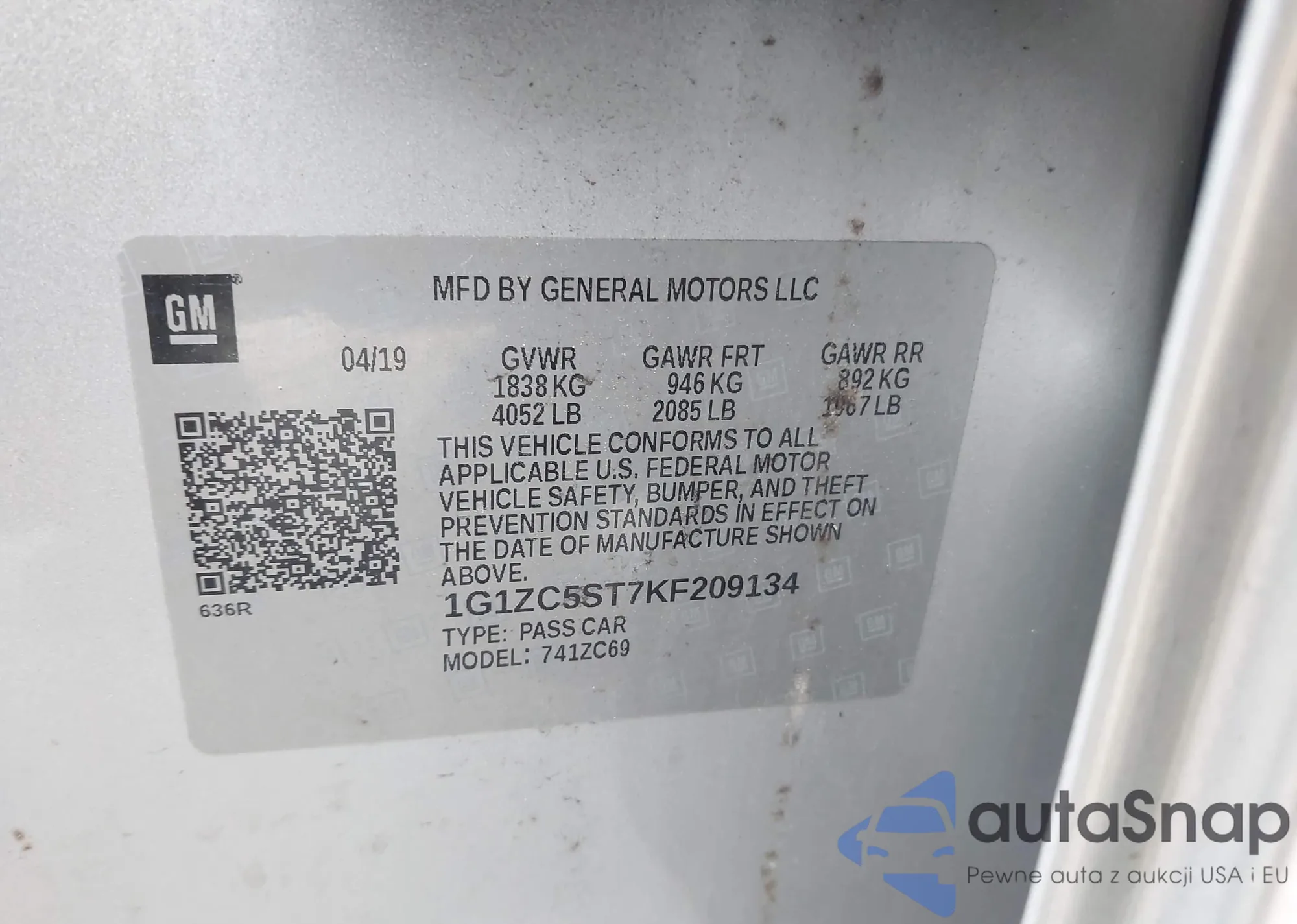 • VIN 1G1ZC5ST7KF209134