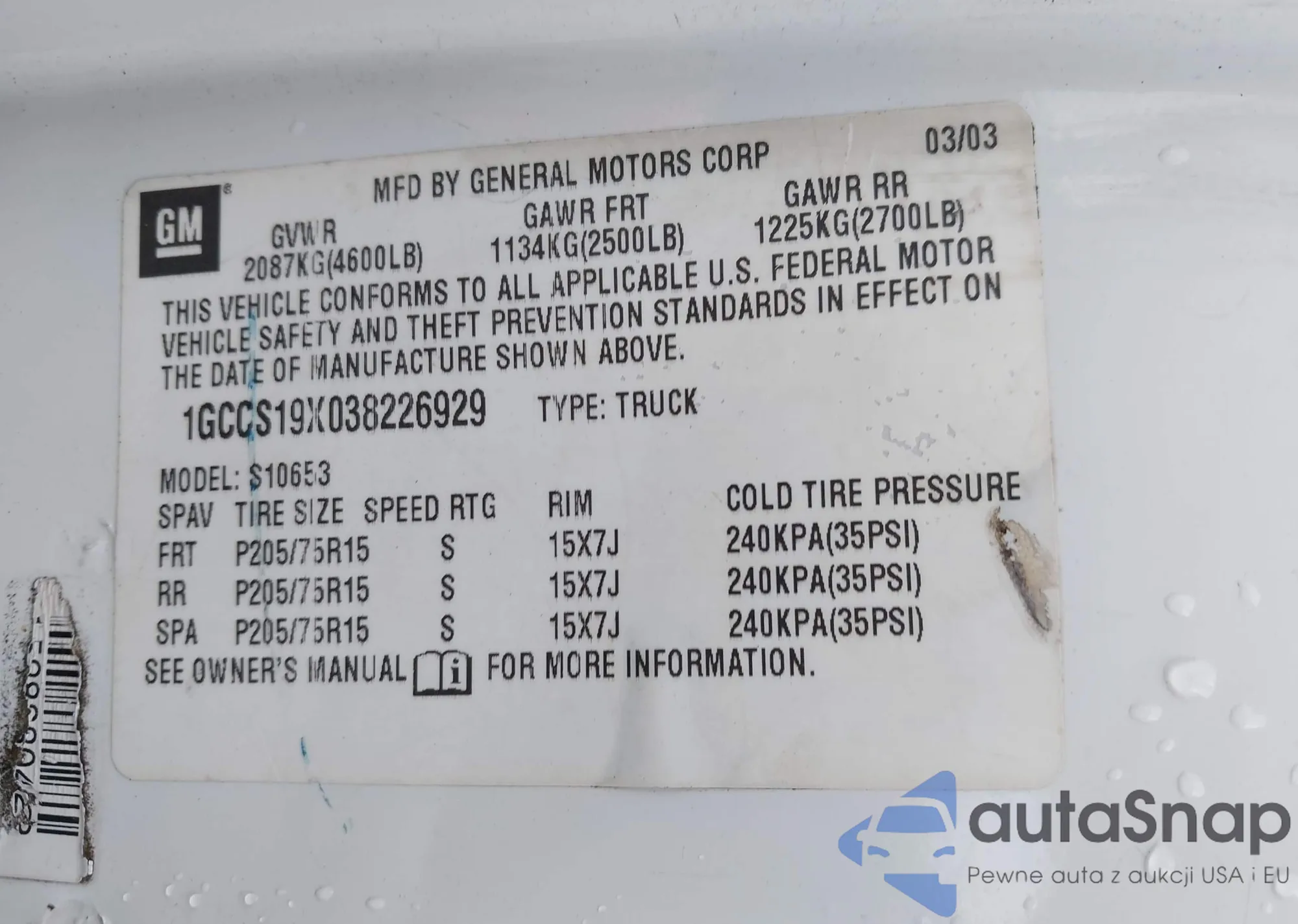 2003 Chevrolet S-10 из США, поврежденный, VIN 1GCCS19X038226929