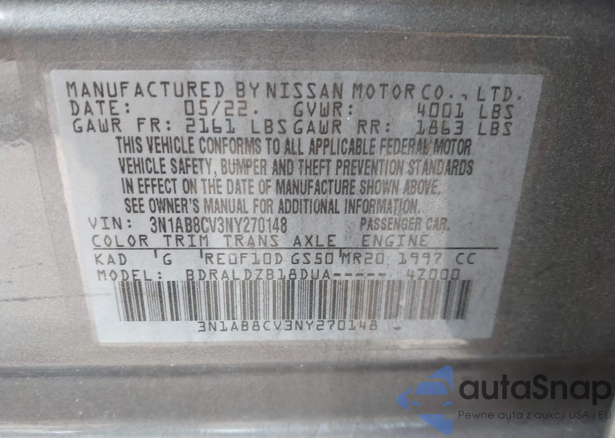 • VIN 3N1AB8CV3NY270148